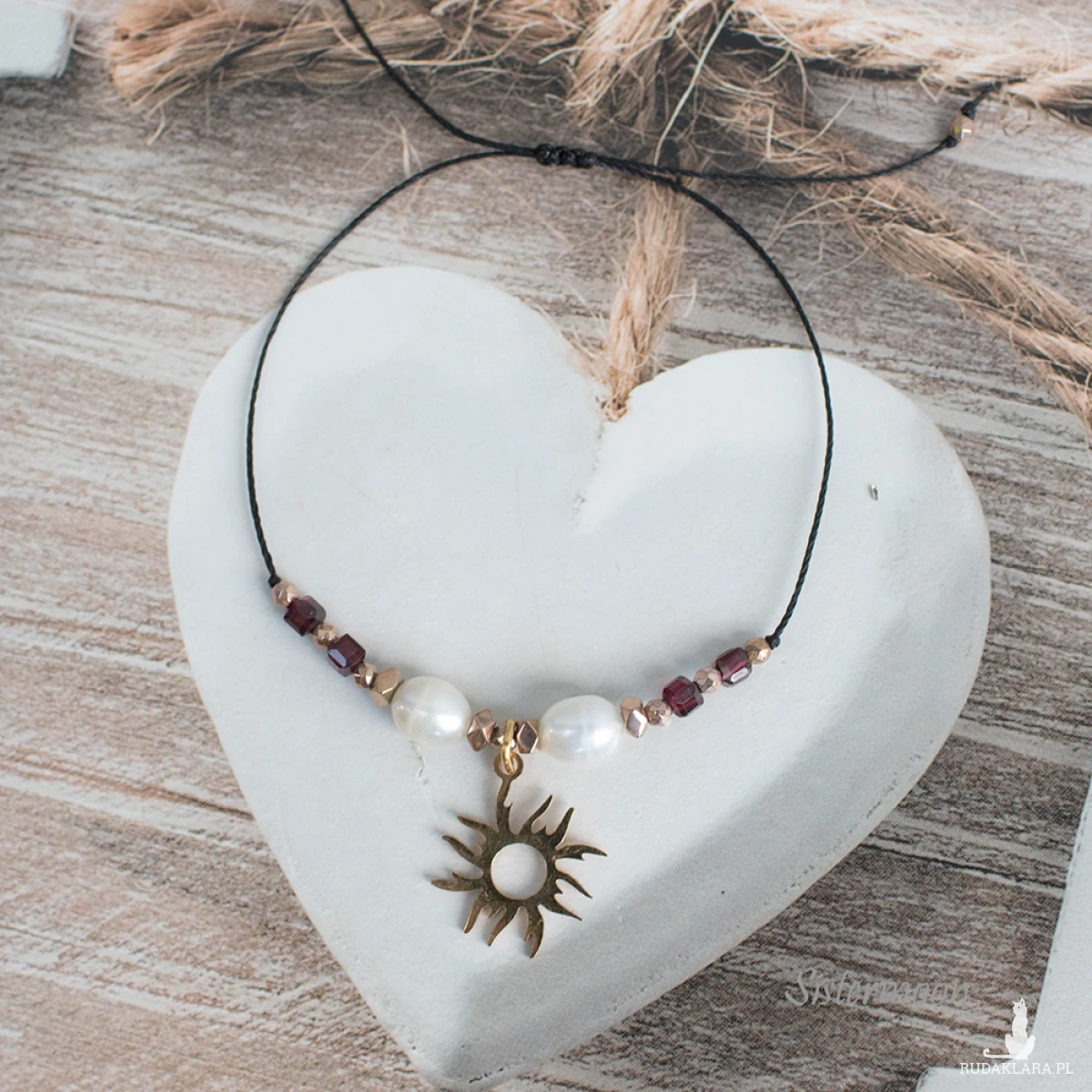 Złota Bransoletka ze Słońcem Perły i Granat. Minimalistyczna Bransoletka wykonana ręcznie ze starannie wyselekcjonowanych minerałów o średnicy 2, 3, i 4 mm: fasetowany granat, hematyt, białe perły rzeczne oraz mocny nierozciągliwy czarny sznureczek z przesuwnym zapięciem makramowym. Zawieszka – pozłacana stal szlachetna.
