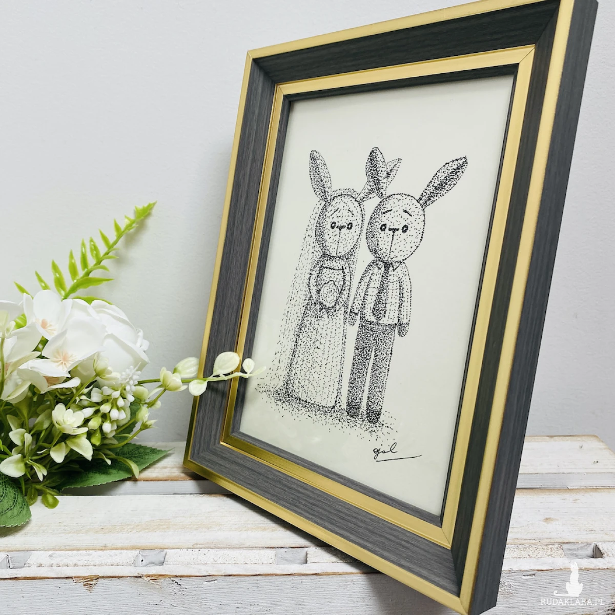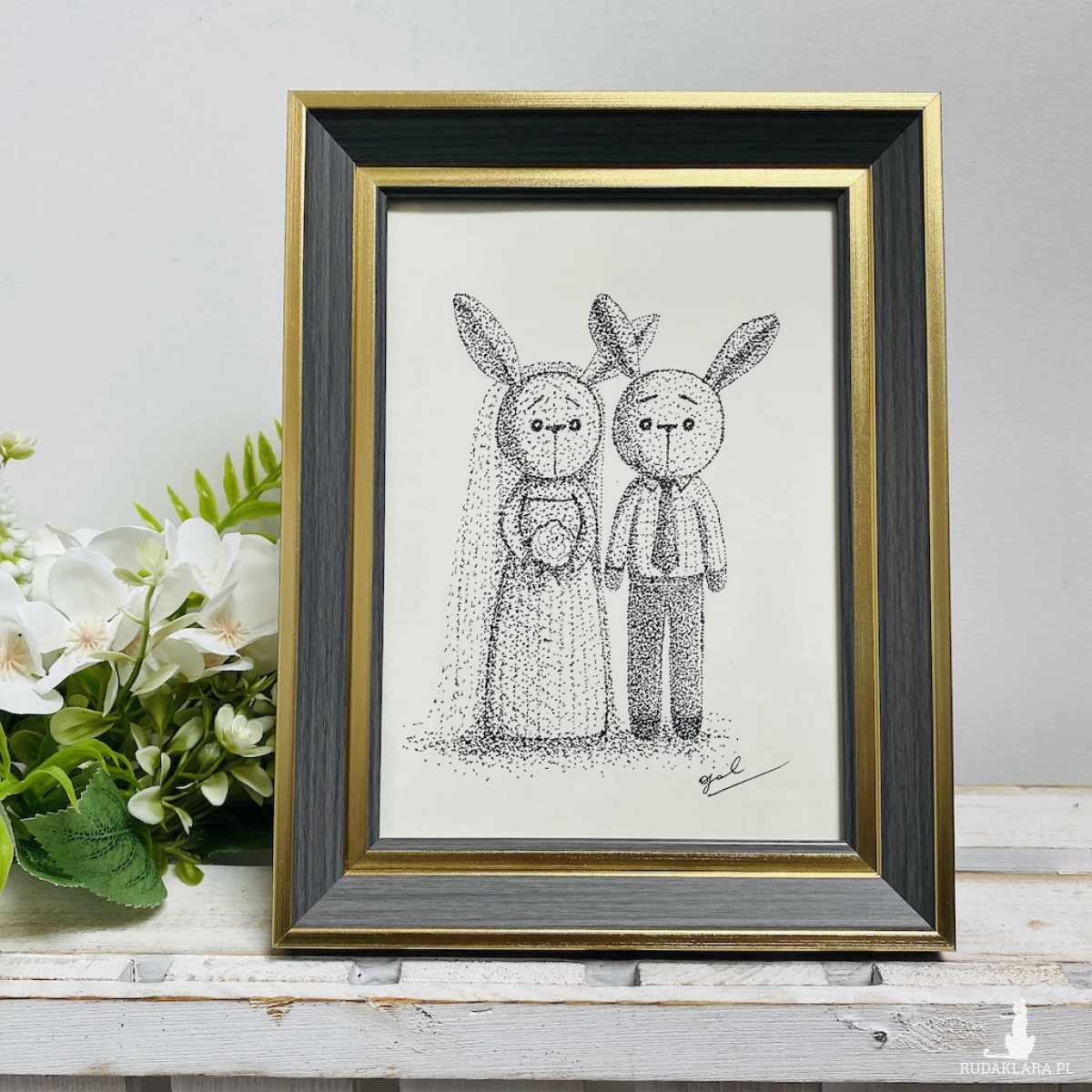 Młoda Para – rysowane piórkiem króliczki w ozdobnej ramce – ręcznie robiony prezent ślubny