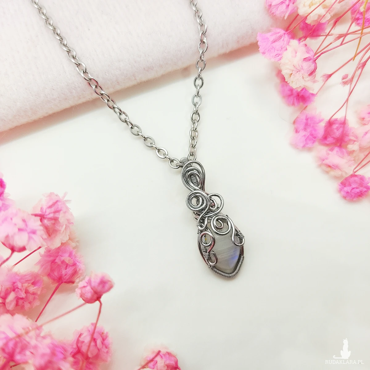 Naszyjnik Kamień Księżycowy ręcznie robiony. Wykonany techniką wire wrapping z drutów ze stali chirurgicznej.