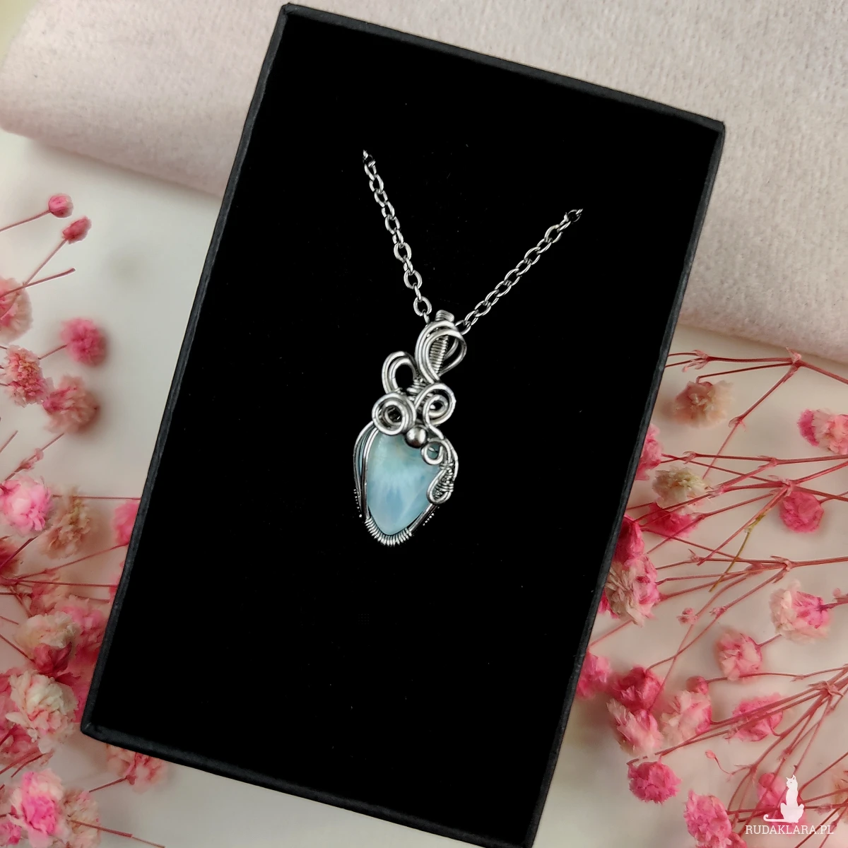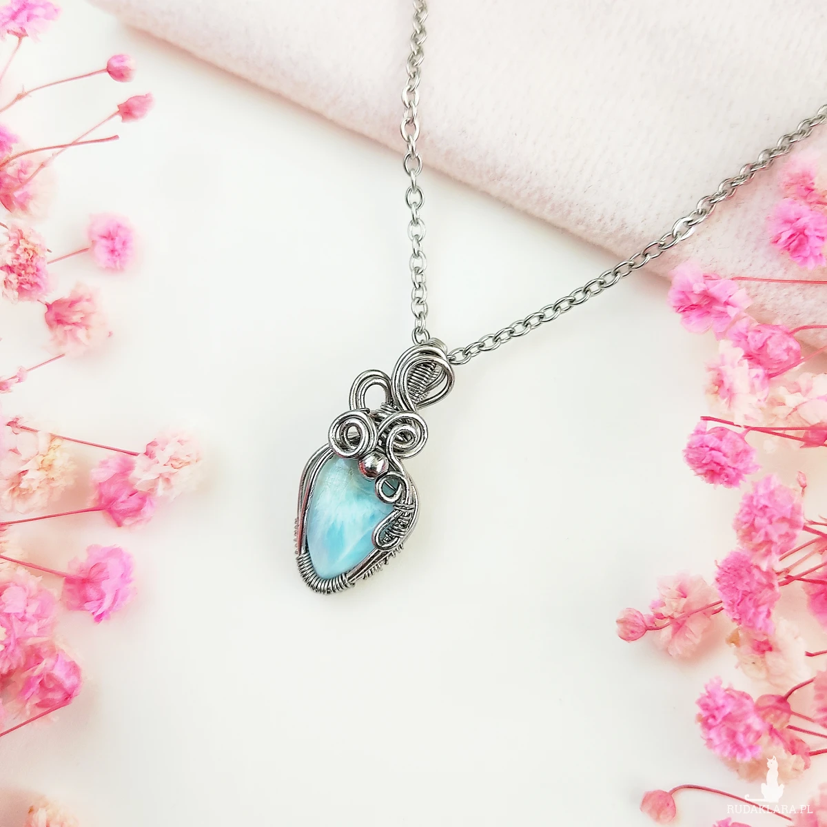 Naszyjnik Larimar ręcznie robiony. Wykonany techniką wire wrapping z drutów ze stali chirurgicznej.