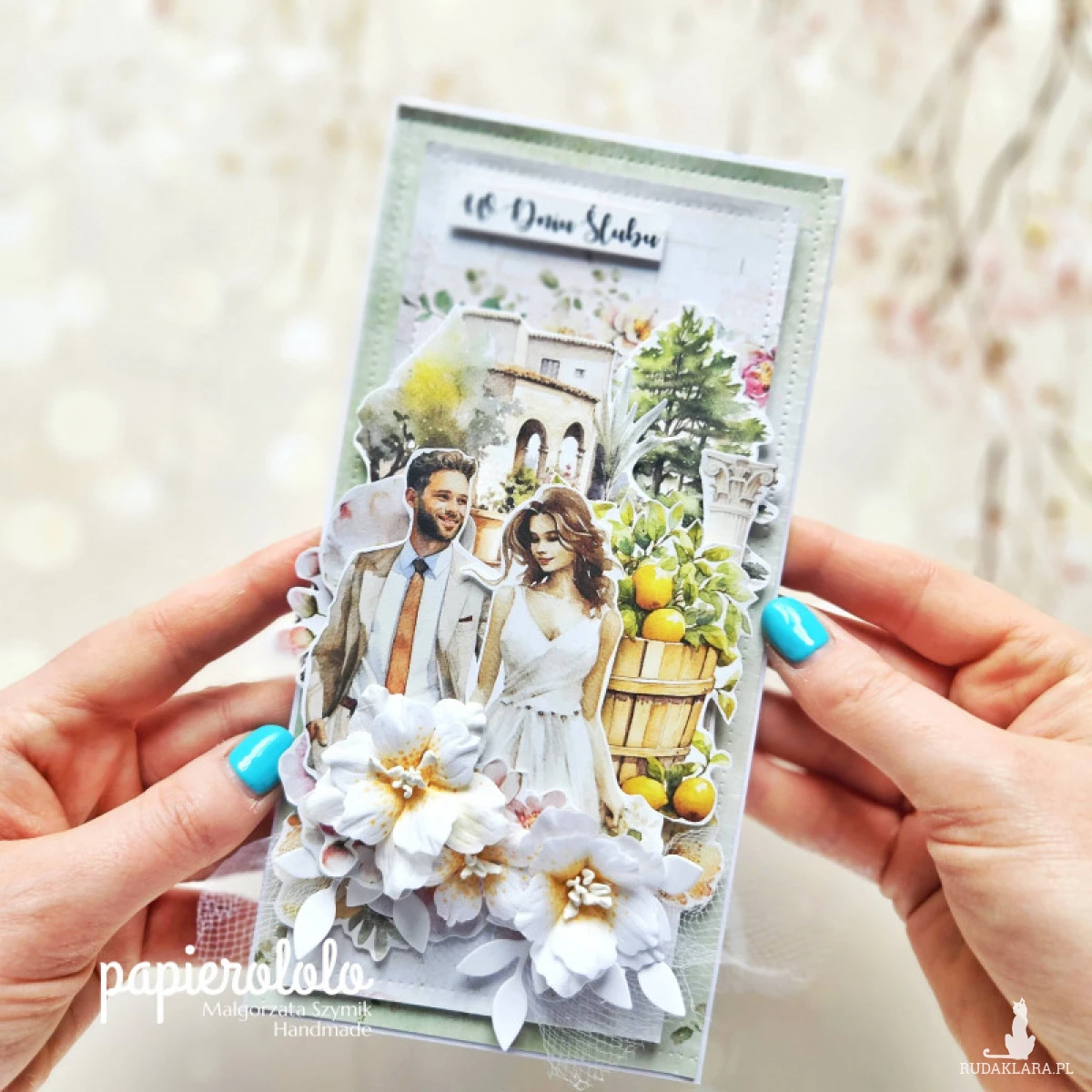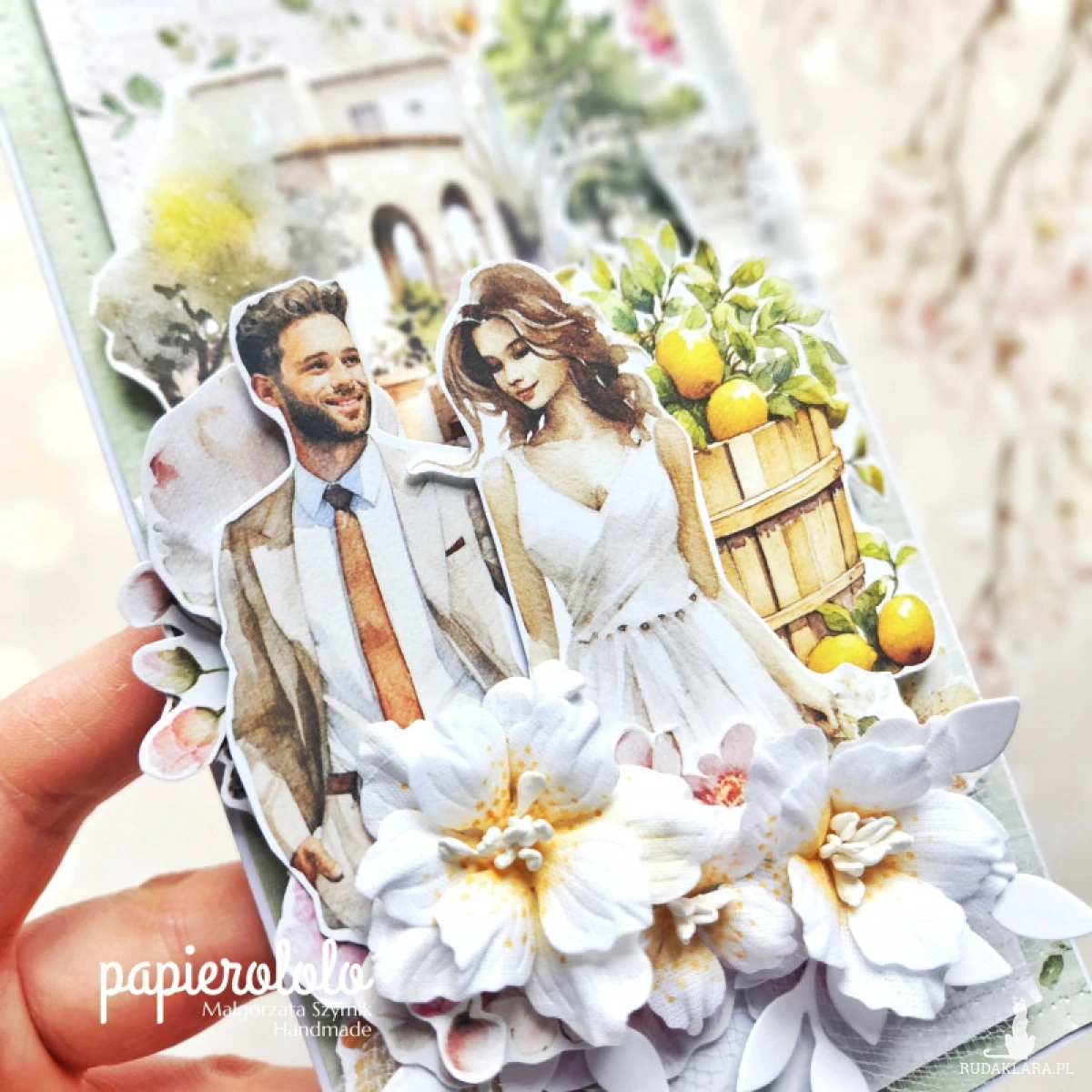Kartka z okazji ślubu lub rocznicy ślubu. Wykonana z papieru z nadrukiem i ozdobiona kwiatami z materiału oraz papierowymi dodatkami.