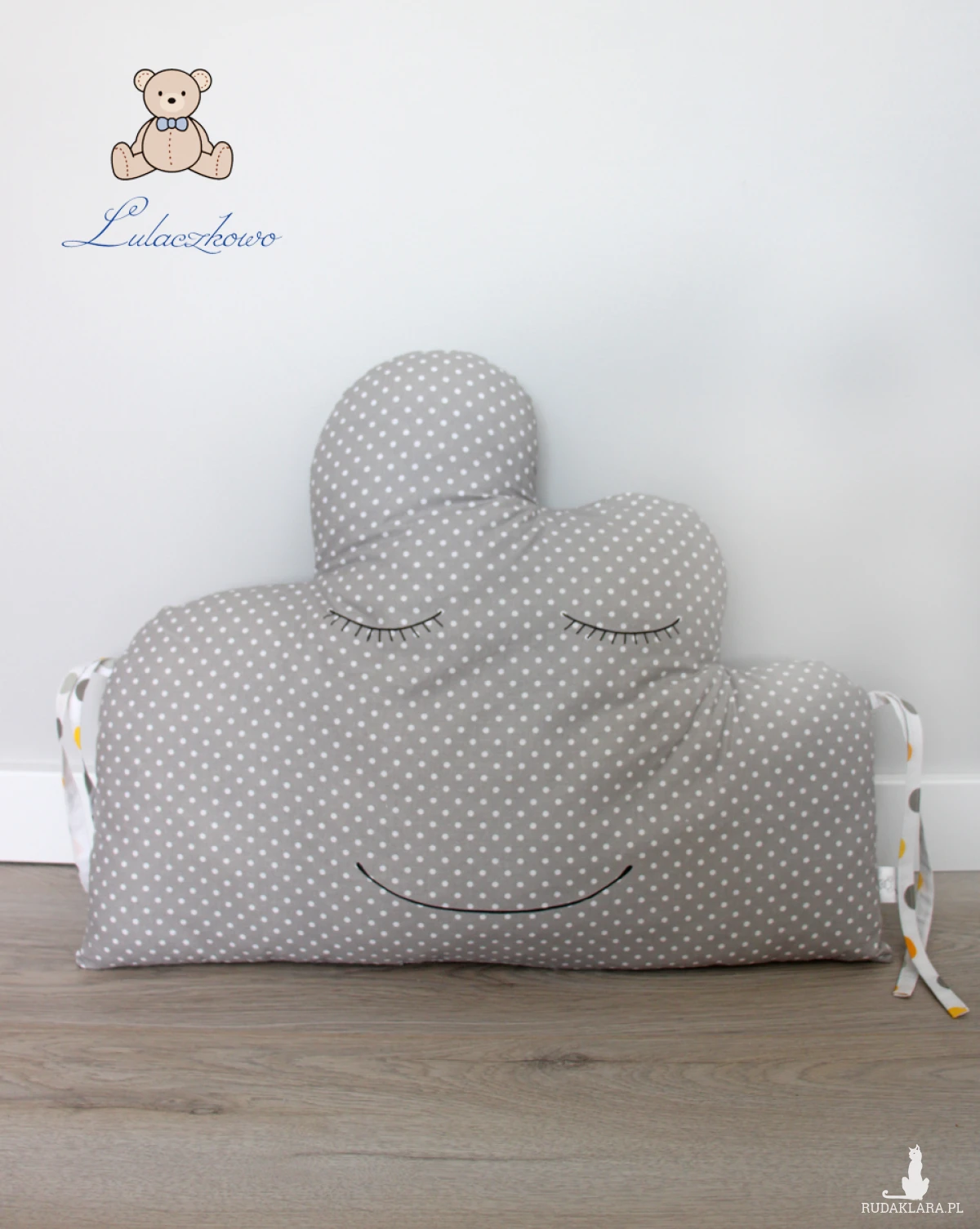 Poduszka dekoracyjna do pokoju dziecięcego w kształcie chmurki, a także moduł do ochraniacza modułowego do łóżeczka dziecięcego, w kolorze szarym w białe kropeczki.