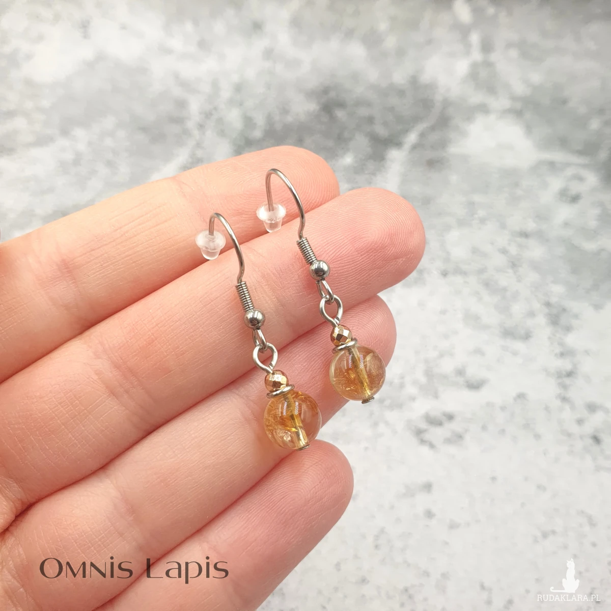 Delikatne, kobiece kolczyki w kolorze złota. Ozdobione kulami naturalnego cytrynu oraz hematytu. Wykonane ze stali szlachetnej.