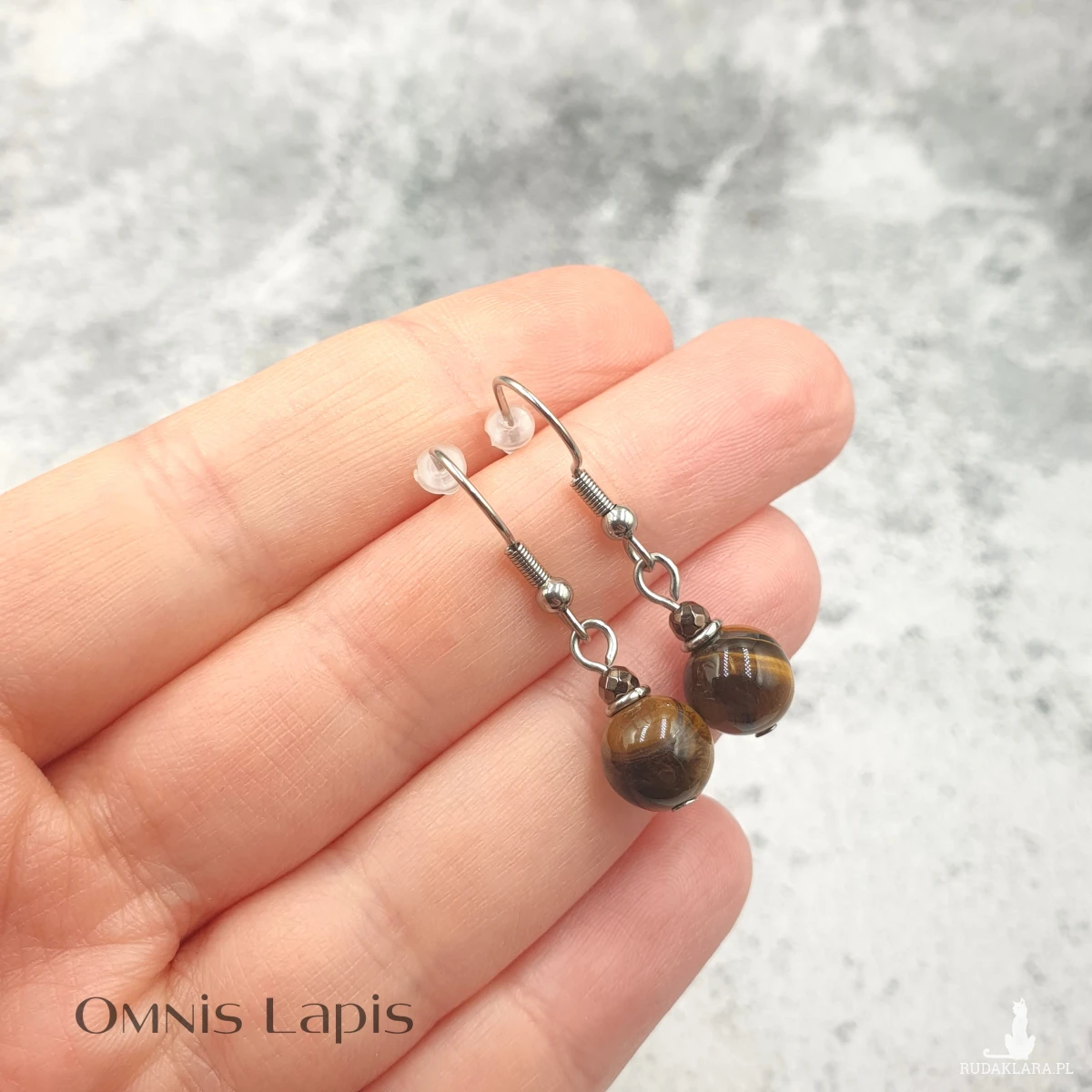 Delikatne, kobiece kolczyki w kolorze błyszczącego brązu. Ozdobione kulami naturalnego tygrysiego oka i hematytu. Wykonane ze stali szlachetnej.