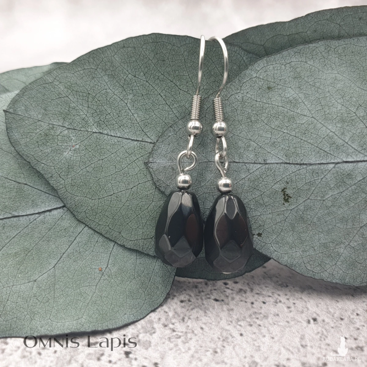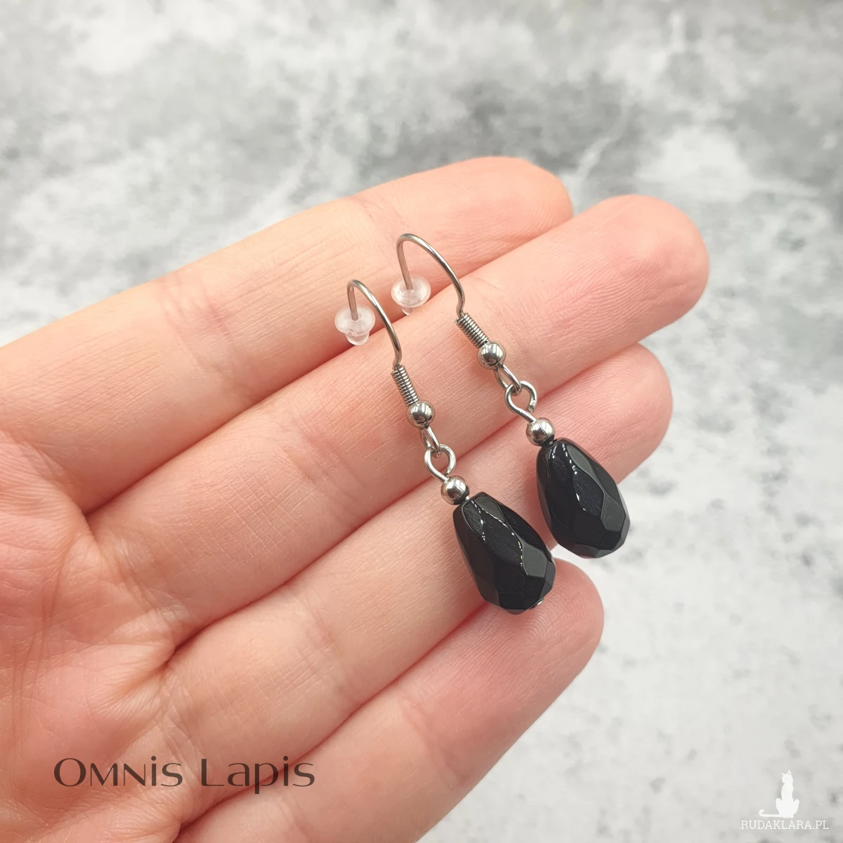 Delikatne, kobiece kolczyki w kolorze błyszczącej czerni. Ozdobione kroplami naturalnego, fasetowanego onyksu. Wykonane ze stali szlachetnej.