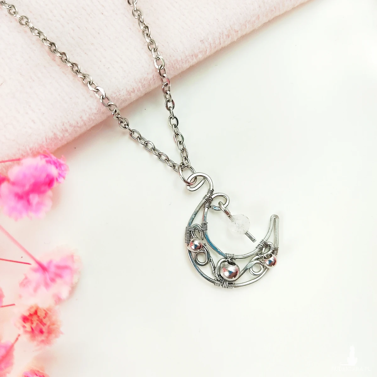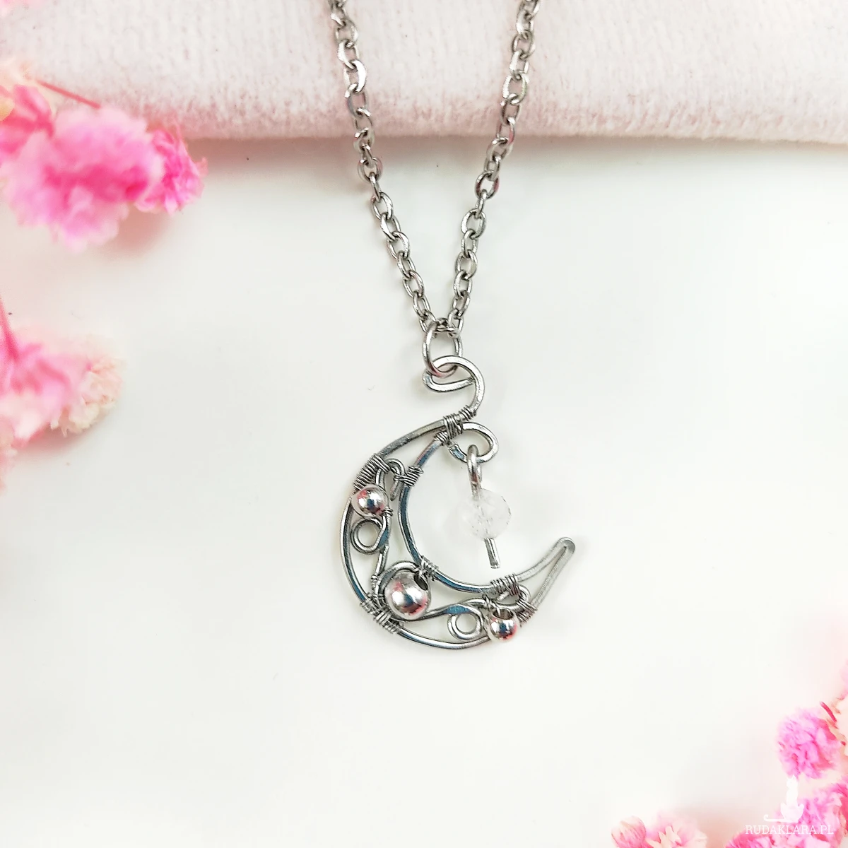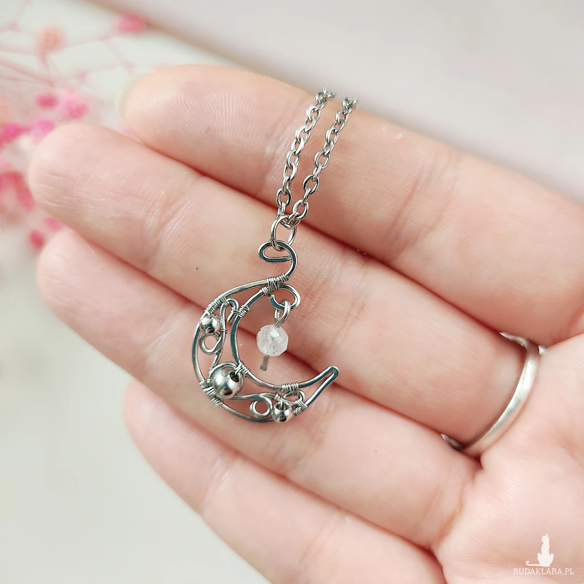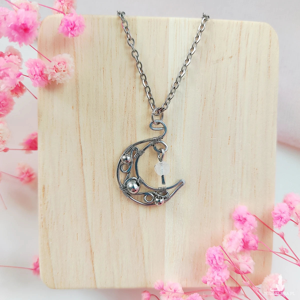 Naszyjnik Kamień Księżycowy - Księżyc ręcznie robiony. Wykonany techniką wire wrapping z drutów ze stali chirurgicznej.