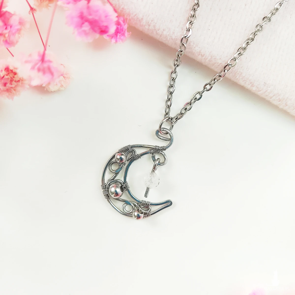 Naszyjnik w kształcie księżyca z kamieniem księżycowym to wyjątkowy dodatek, który łączy w sobie subtelność i magię naturalnych minerałów z precyzyjnym rękodziełem. Biżuteria została wykonana metodą wire wrapping, czyli ręcznego oplatania drutem, bez użycia lutowania. Użyta stal chirurgiczna zapewnia trwałość i odporność na korozję, a także jest odpowiednia dla osób z alergiami skórnymi.