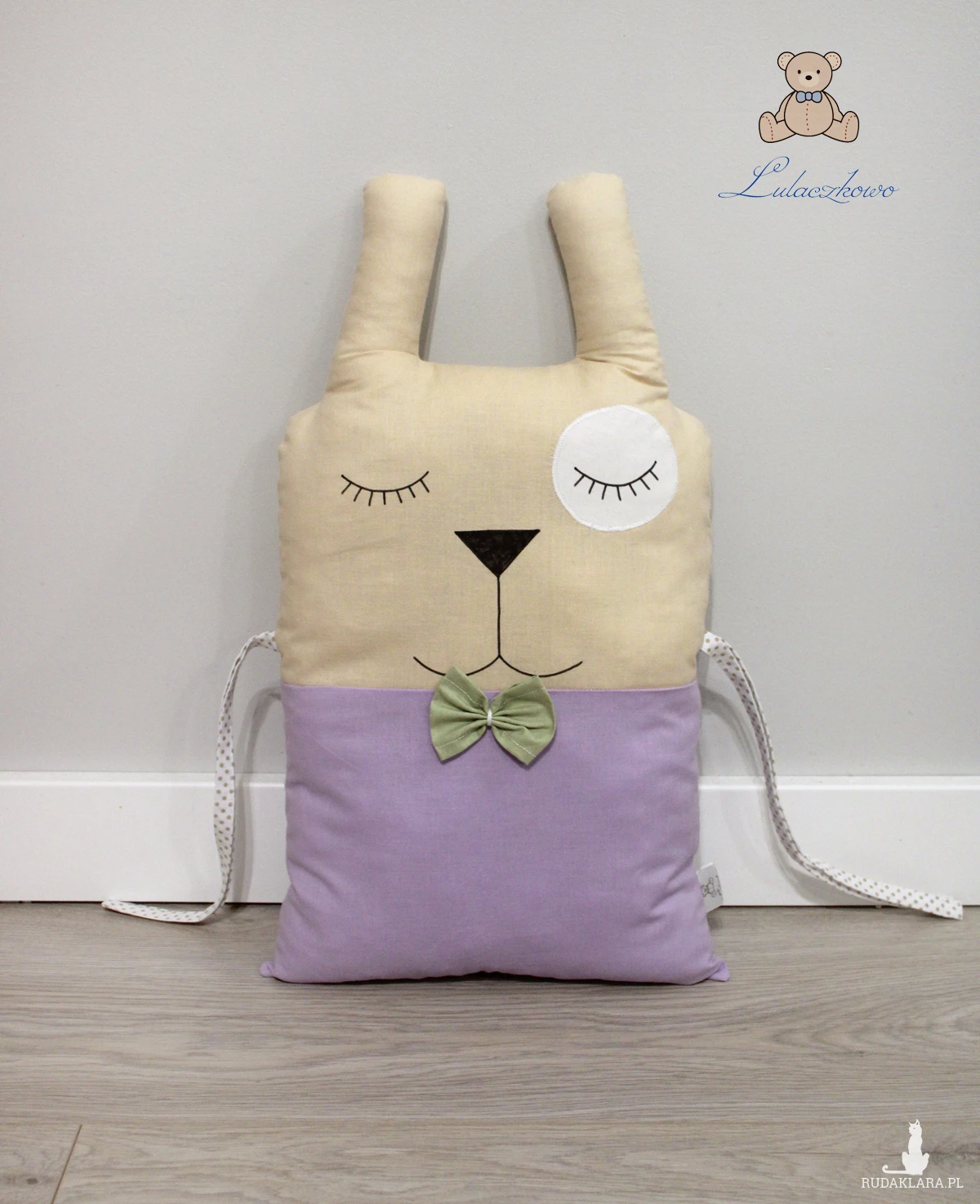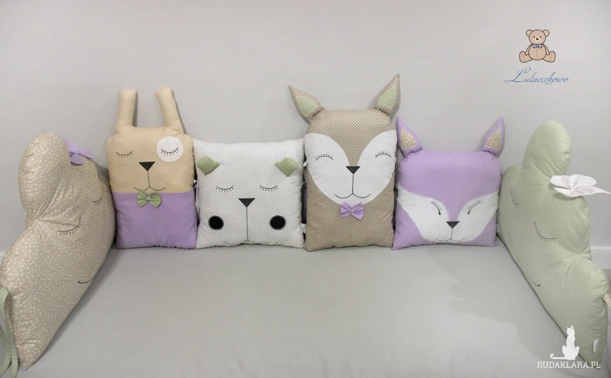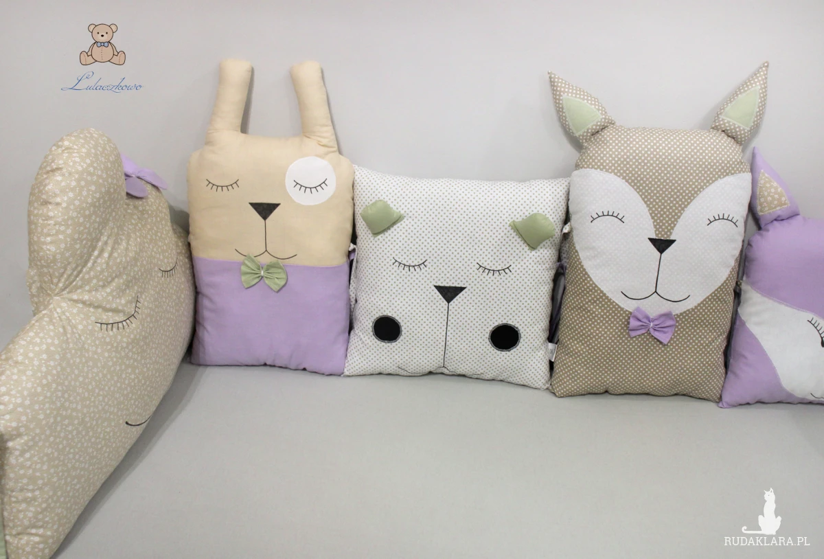 Poduszka ozdobna dziecięca w kształcie króliczka, moduł do ochraniacza modułowego do łóżeczka dziecięcego. Dostępna w wielu wariantach kolorystycznych. Oferta dotyczy pojedynczej sztuki z troczkami do wiązania bądź bez. Podusia uszyta jest z 100% bawełny i wypełniona antyalergiczną kulką silikonową. Oczka i nosek malowane wodoodpornym markerem do tkanin. Może być zarówno śliczną ozdobą dziecięcego pokoju, ochroną dla dziecka, jak również przytulanką.