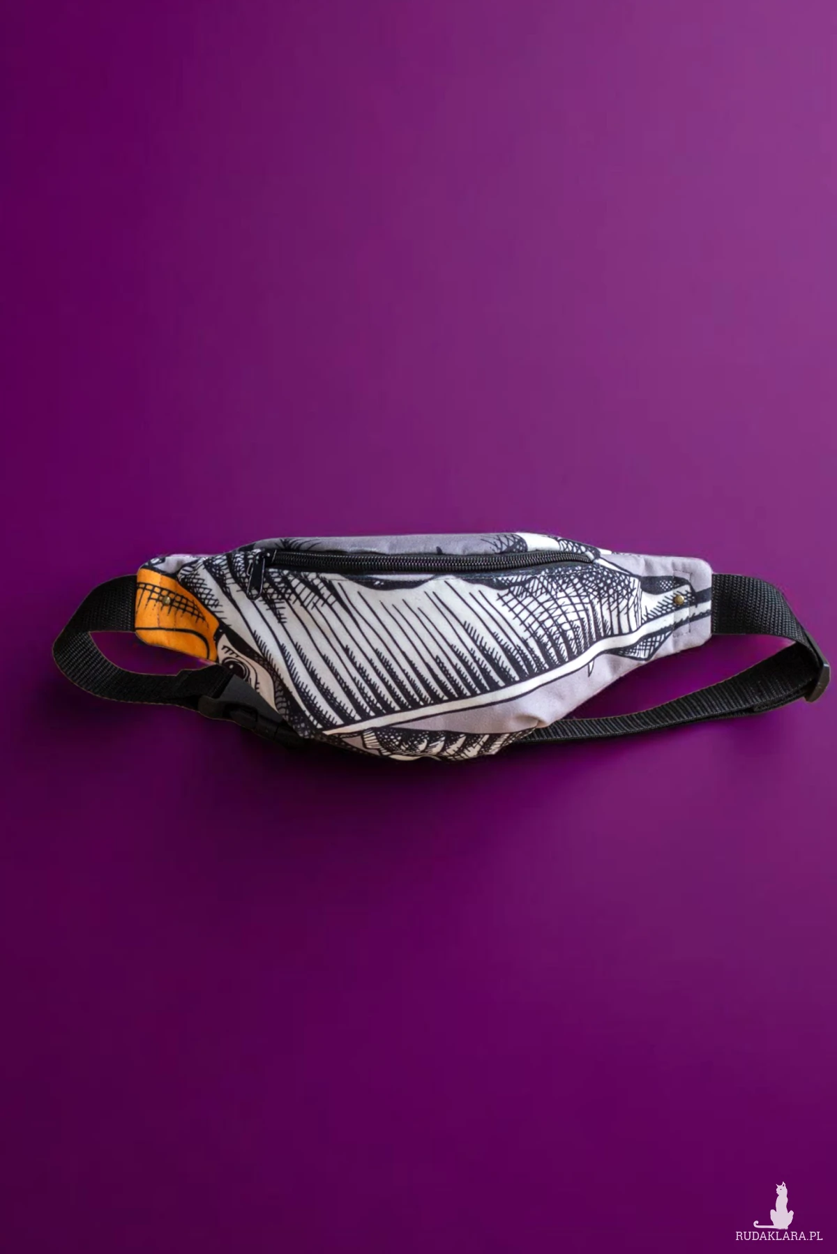 Saszetka torebka biodrowa nerka średniej wielkości wykonana z weluru w tukany w kolorze szarym.