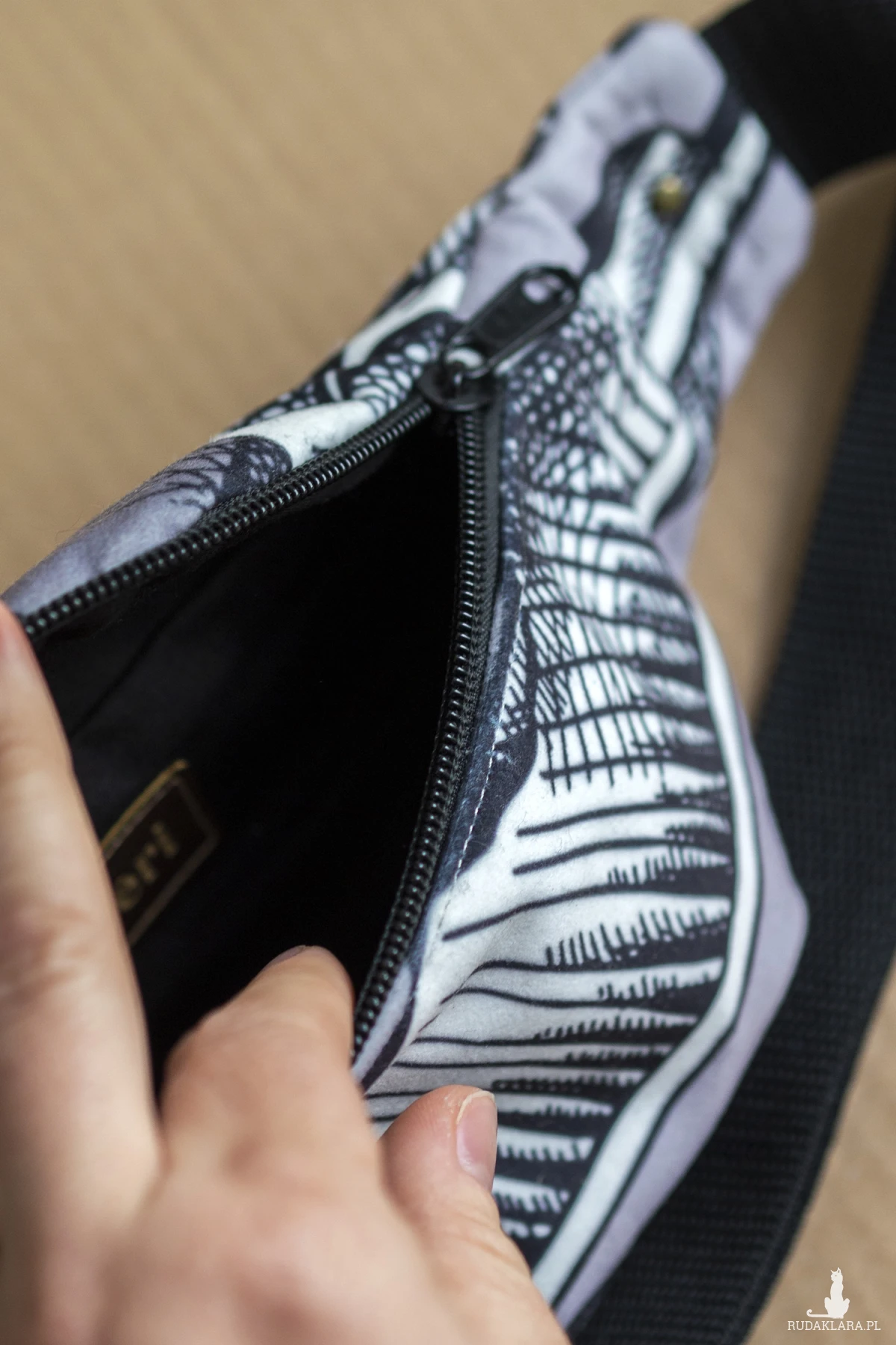 Nerka zapinana jest na suwak. Zamocowana na czarnym, parcianym pasie o regulowanej długości.