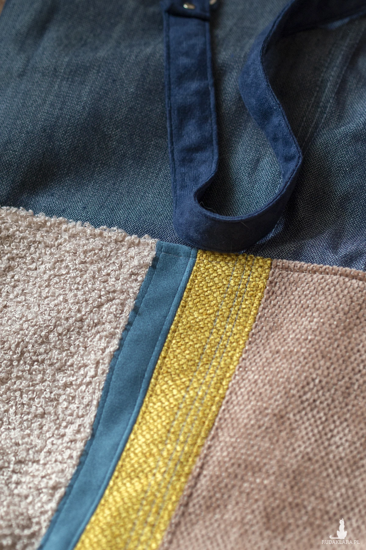 Z przodu dwie kieszenie w stylu patchwork. Całość zapinana na zapięcie magnetyczne.