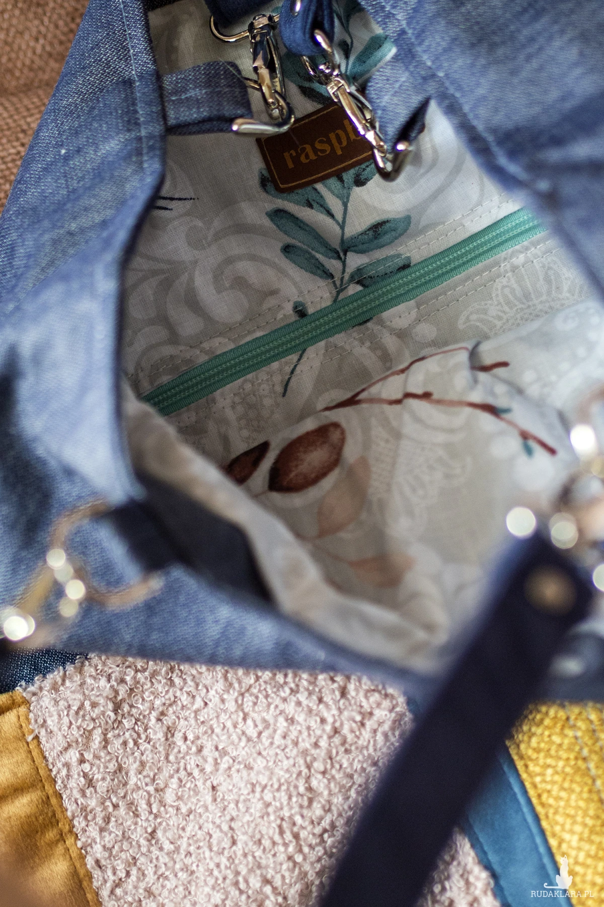 Bawełniana, biała podszewka we wzory, w środku i z tyłu torby kieszonki zapinane na suwak.