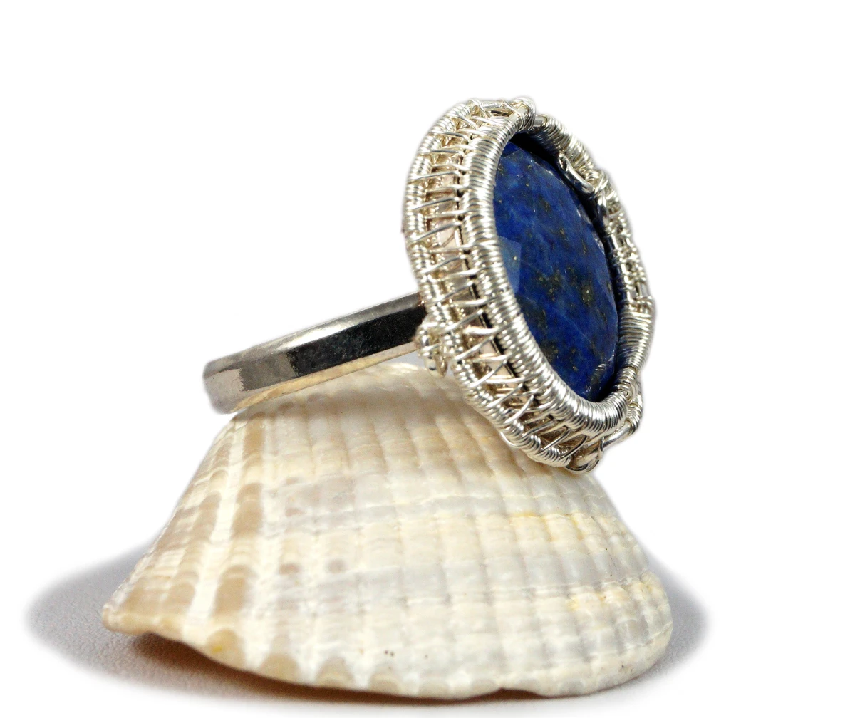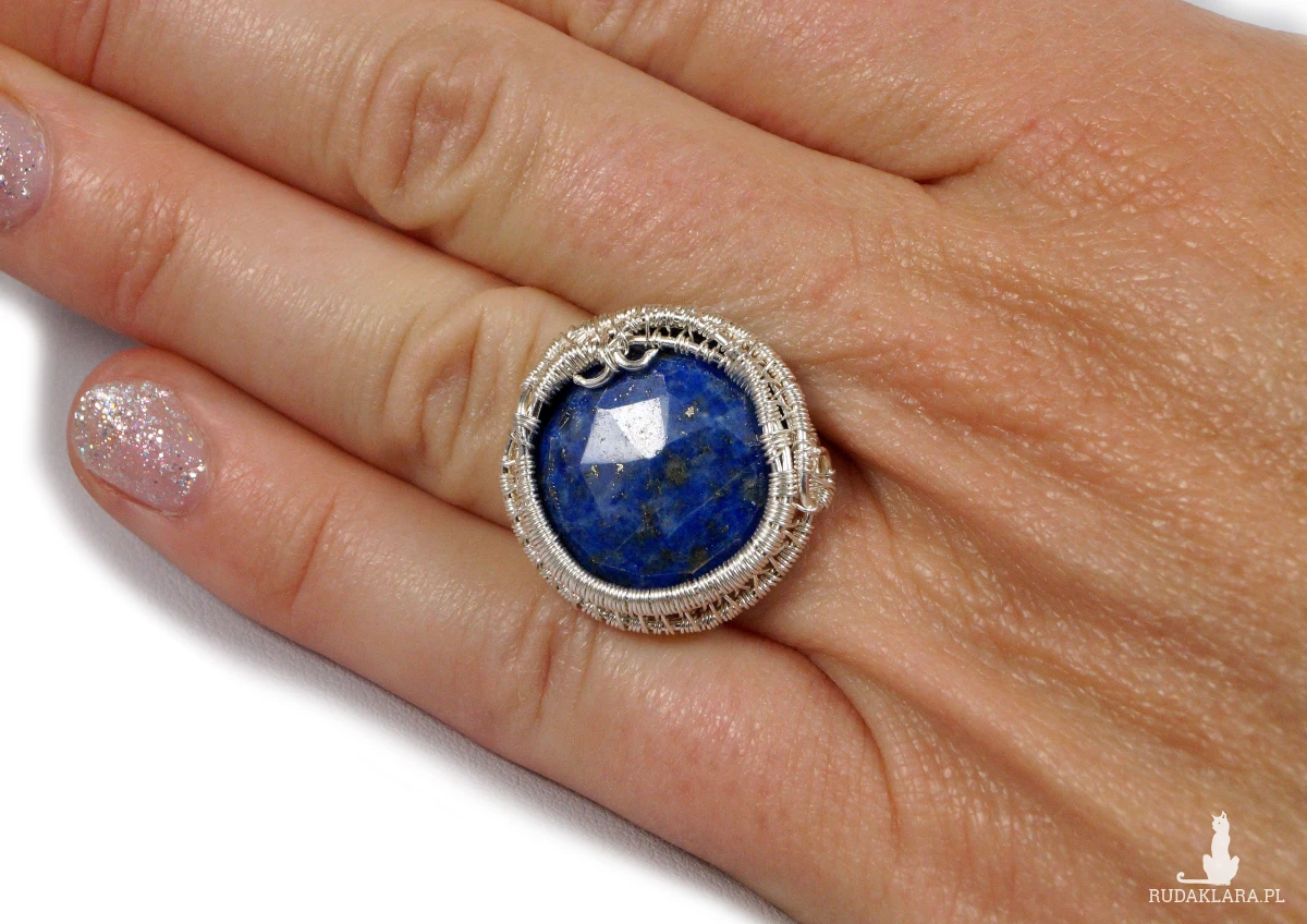 Misternie wykonany pierścionek z fasetowanym kaboszonem lapis lazuli w niebiesko złotym kolorze.