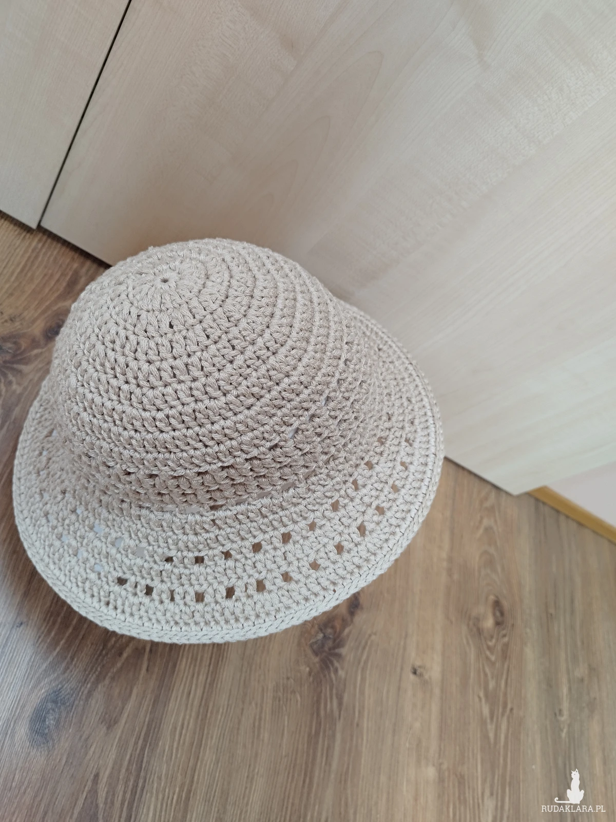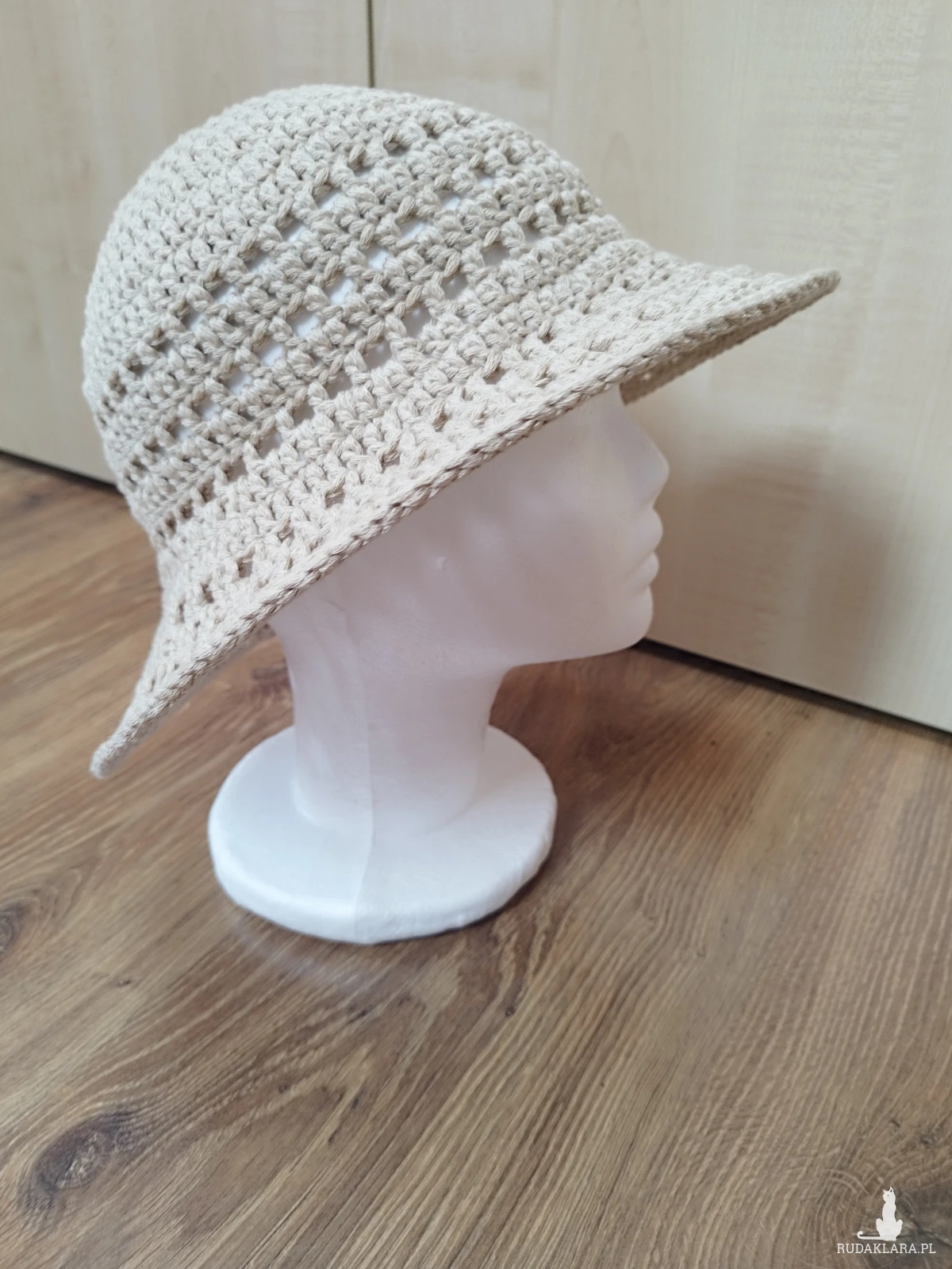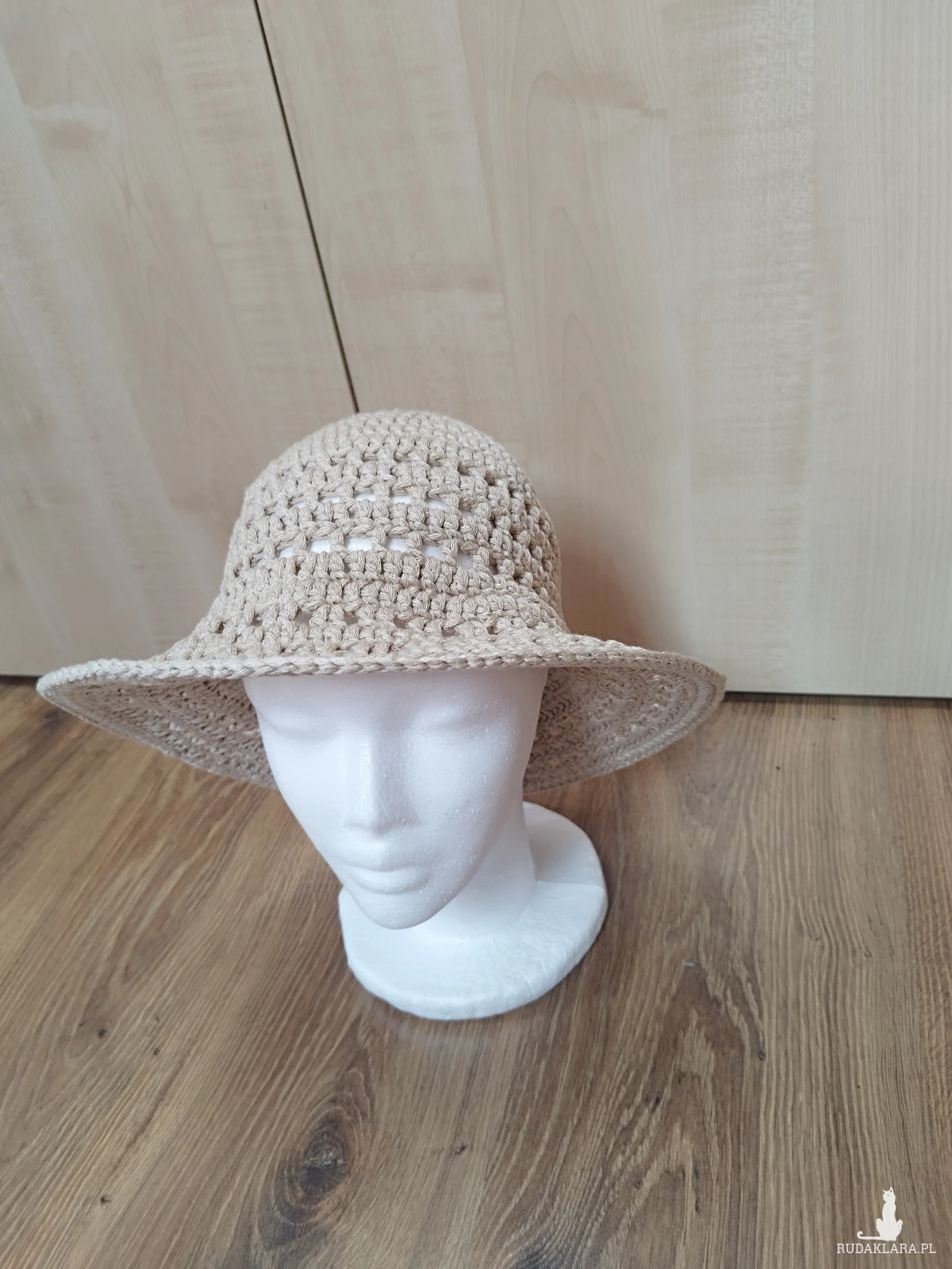 Kapelusz zrobiony na szydełku z włóczki wiskozowej na lato, przewiewny. Kolor piaskowy. Pasuje na obwód głowy ok 53-55cm. Można zamówić inny kolor i rozmiar