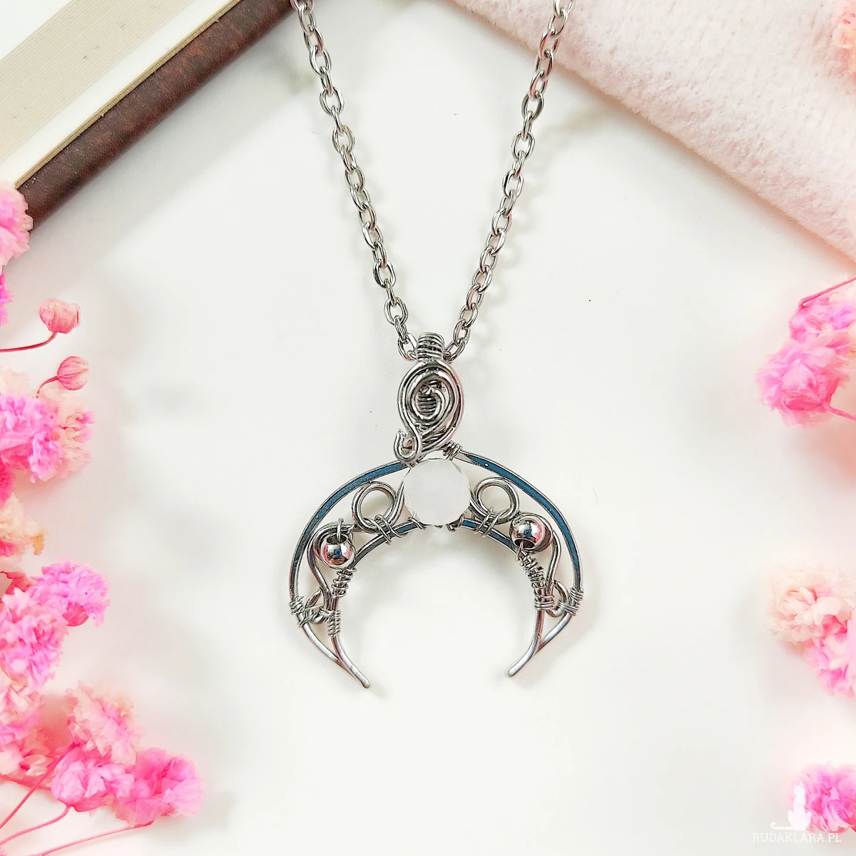 Unikalny naszyjnik w kształcie lunuli z naturalnym kamieniem księżycowym, wykonany ręcznie metodą wire wrapping z trwałej i hipoalergicznej stali chirurgicznej. Symbol lunuli, od wieków kojarzony z kobiecą energią, płodnością i ochroną, w połączeniu z subtelnym blaskiem kamienia księżycowego tworzy wyjątkową biżuterię pełną symboliki.
