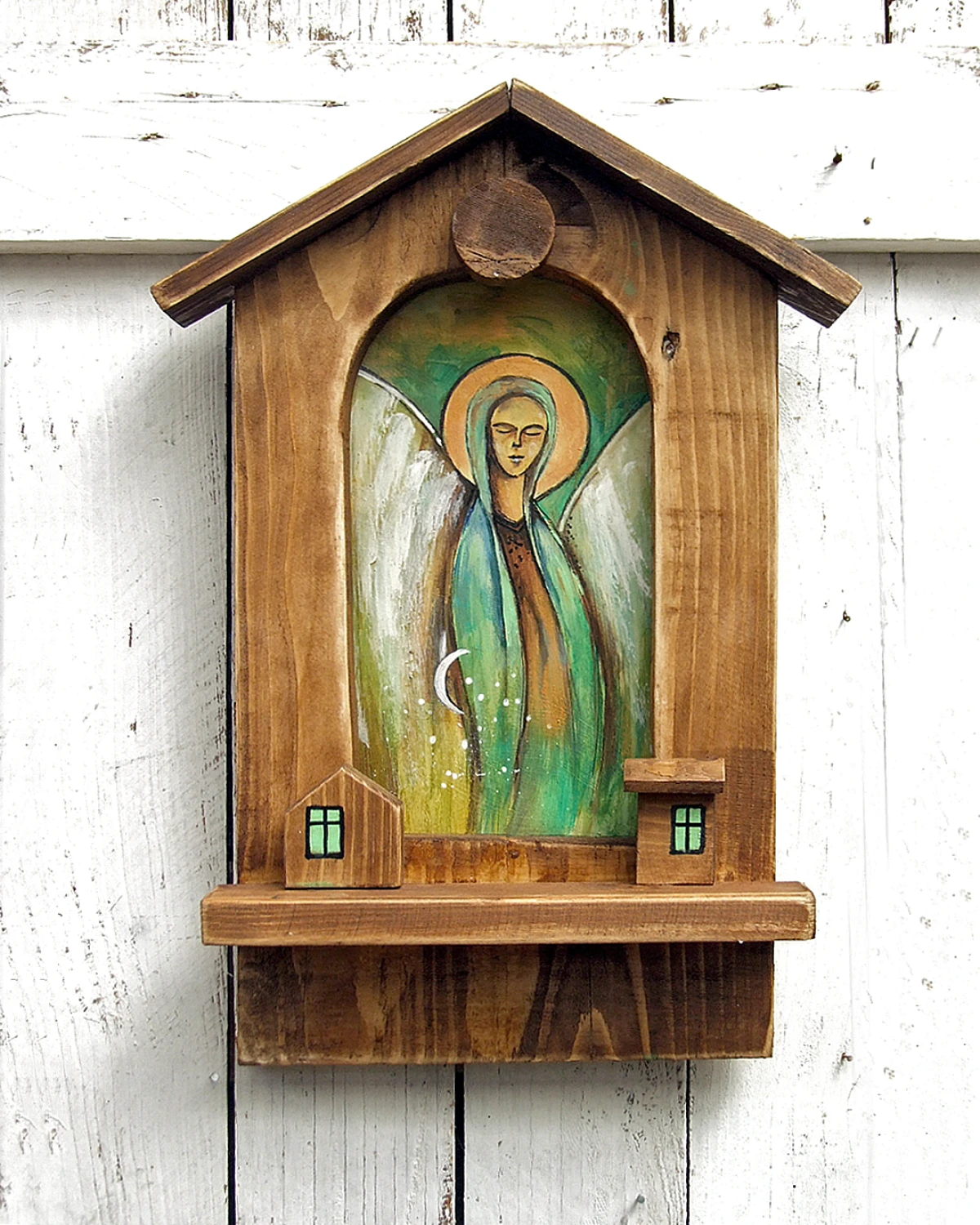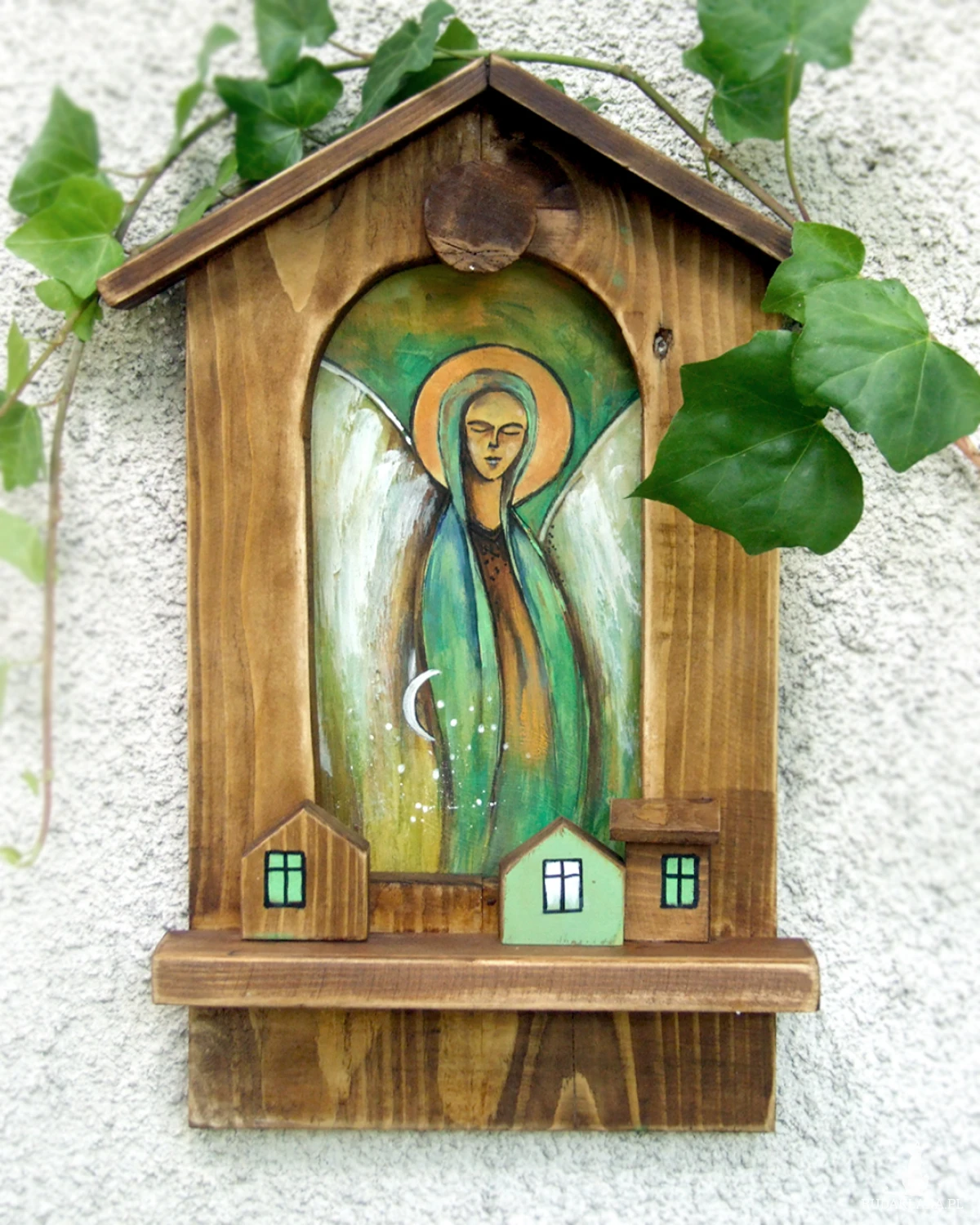 Drewniana Kapliczka - klimatyczna i pełna uroku dekoracja wnętrza. Może być także zawieszona w ogrodzie - w miejscu osłoniętym od deszczu, albo na werandzie. Taka kapliczka to także miły, oryginalny prezent do nowego domu.