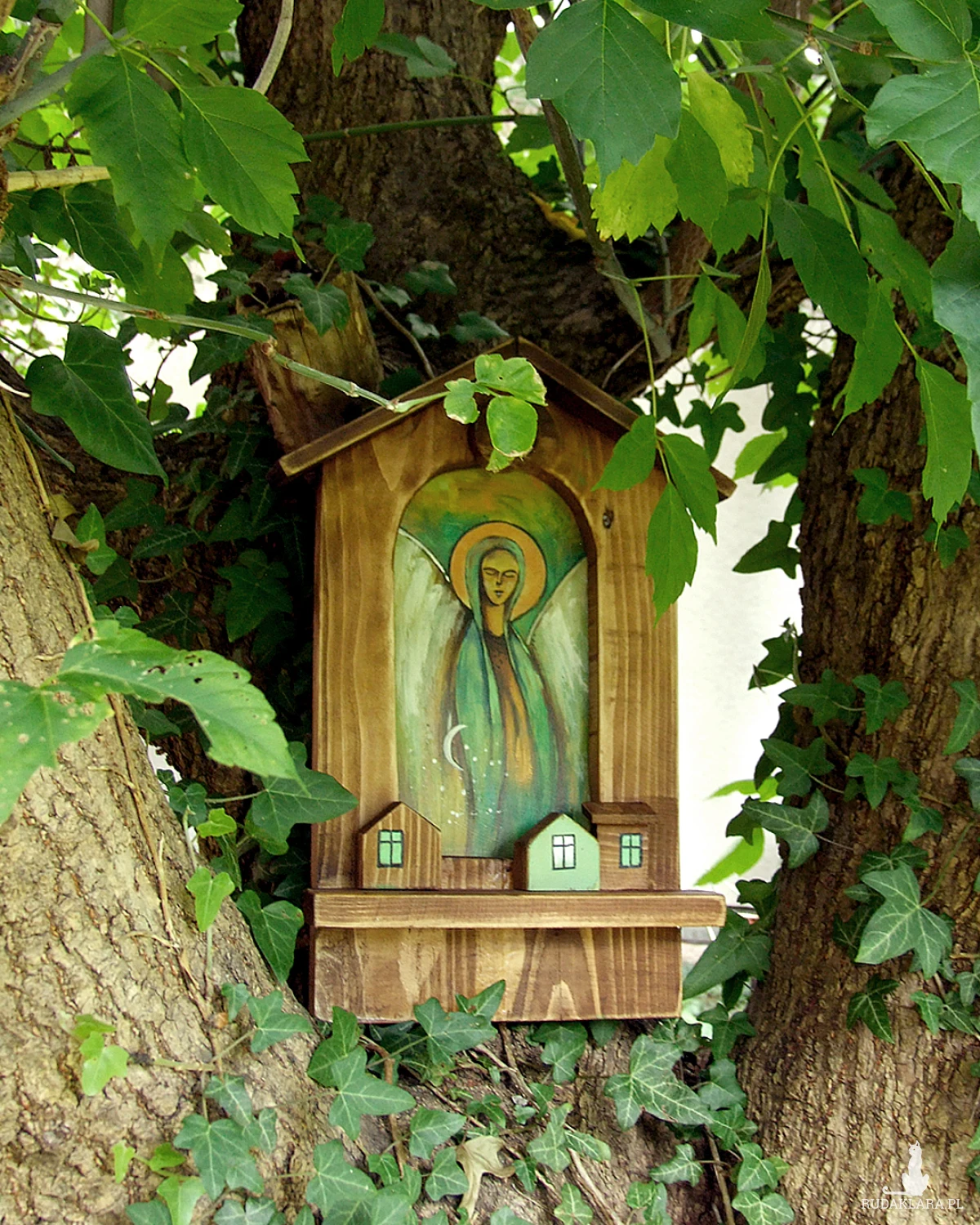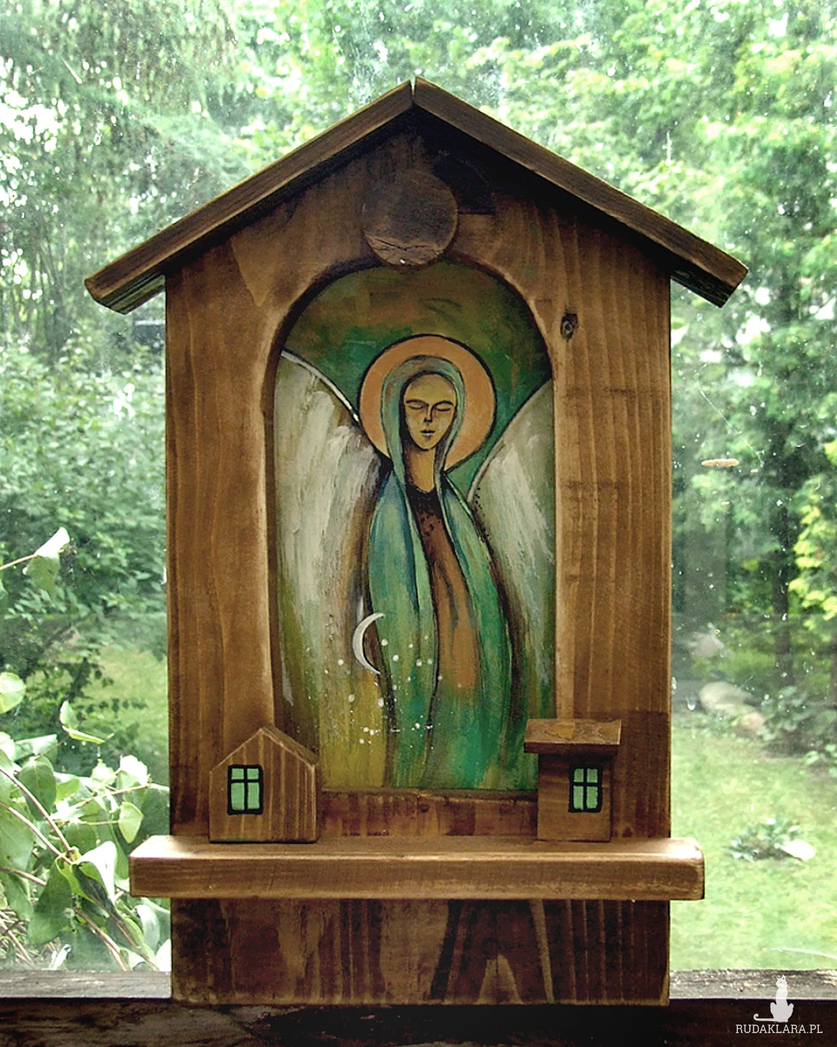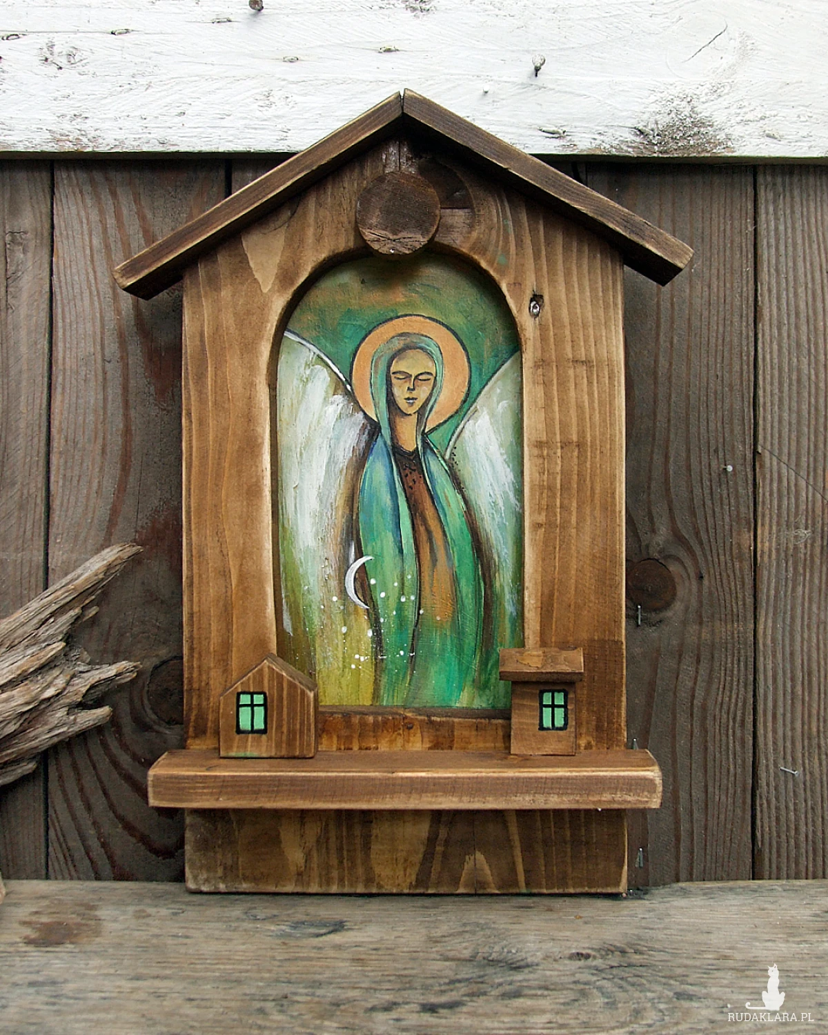 Kapliczka została docięta ze starej sosnowej deski, która ma ślady wcześniejszego użytkowania (otworki po gwoździach). W desce jest wycięte jakby okienko, a w nim zamontowany jest ręcznie malowany obrazek z aniołem. Obrazek jest namalowany na cienkiej sklejce, farbami akrylowymi - cała kapliczka jest zabezpieczona matowym lakierem akrylowym, nietoksycznym i wodoodpornym.