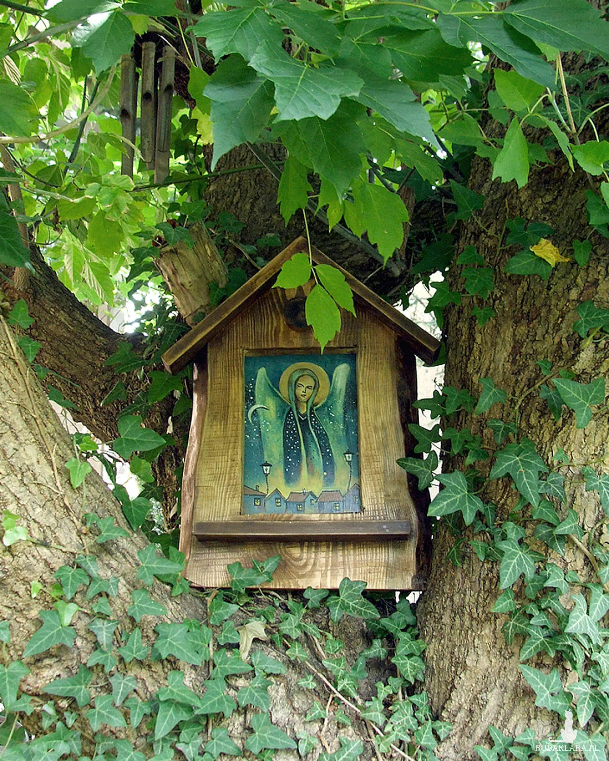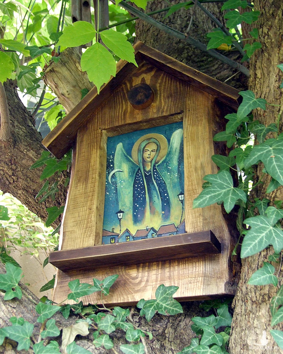 Kapliczka została docięta ze starej sosnowej deski, o nierównych krawędziach. W desce jest wycięte jakby okienko, a w nim zamontowany jest obrazek z aniołem. Obrazek ręcznie malowany na cienkiej sklejce, farbami akrylowymi - cała kapliczka jest zabezpieczona matowym lakierem akrylowym, nietoksycznym i wodoodpornym.