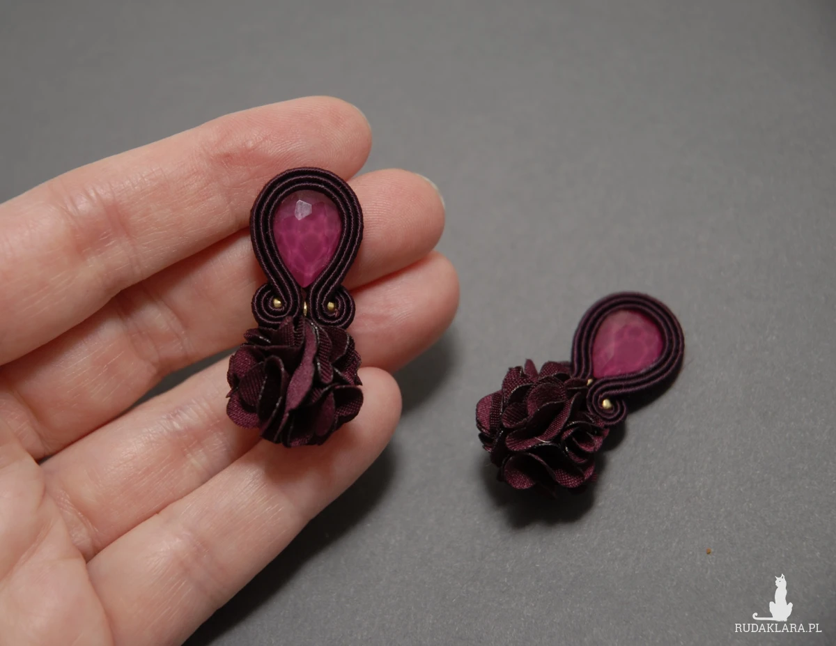 oferuję kolczyki (sztyfty) lub klipsy zrobione techniką sutasz, ozdobione fasetowanymi szklanymi kaboszonami i kwiatkami z materiału