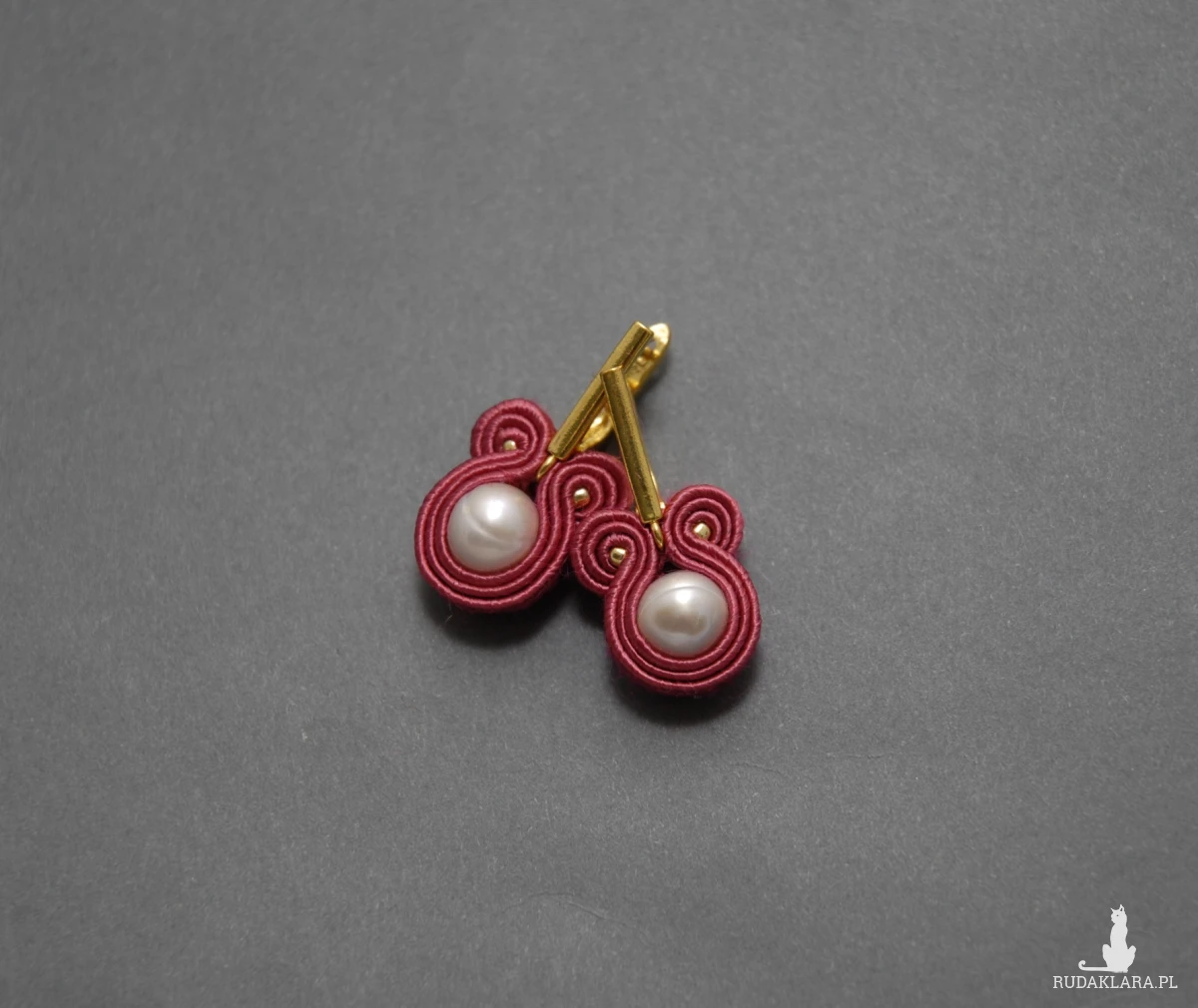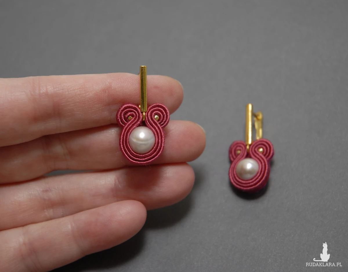 oferuję małe bordowe kolczyki zrobione techniką sutasz, ozdobione perłami seashell (w różowym odcieniu)