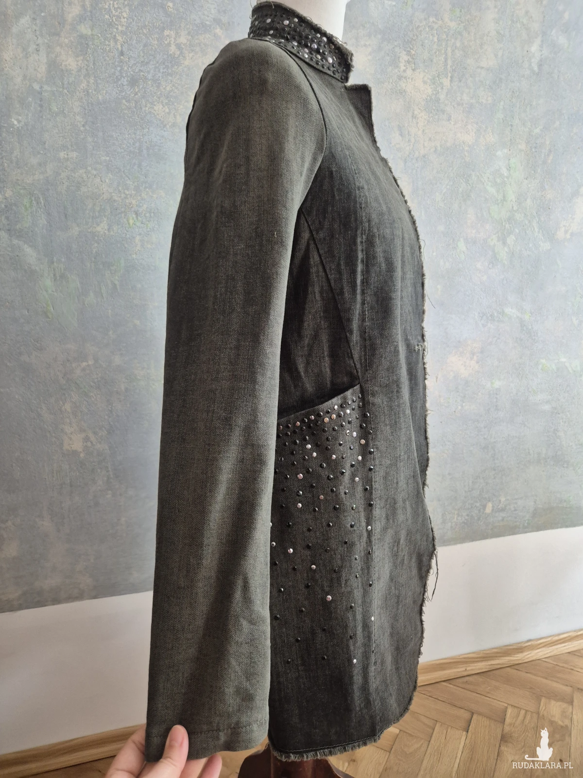 Włoska bawełniana lekko rozciągliwa kurtka frakowa -płaszczyk ,rozmiar 38 długość całości 85 cm długość rękawa 62 cm osoba na zdjęciu ma 159 cm kurtka ma po bokach dwie kieszenie, jest w  świetnym stanie polecam układa się fantastycznie Jest bardzo miękka,polecam