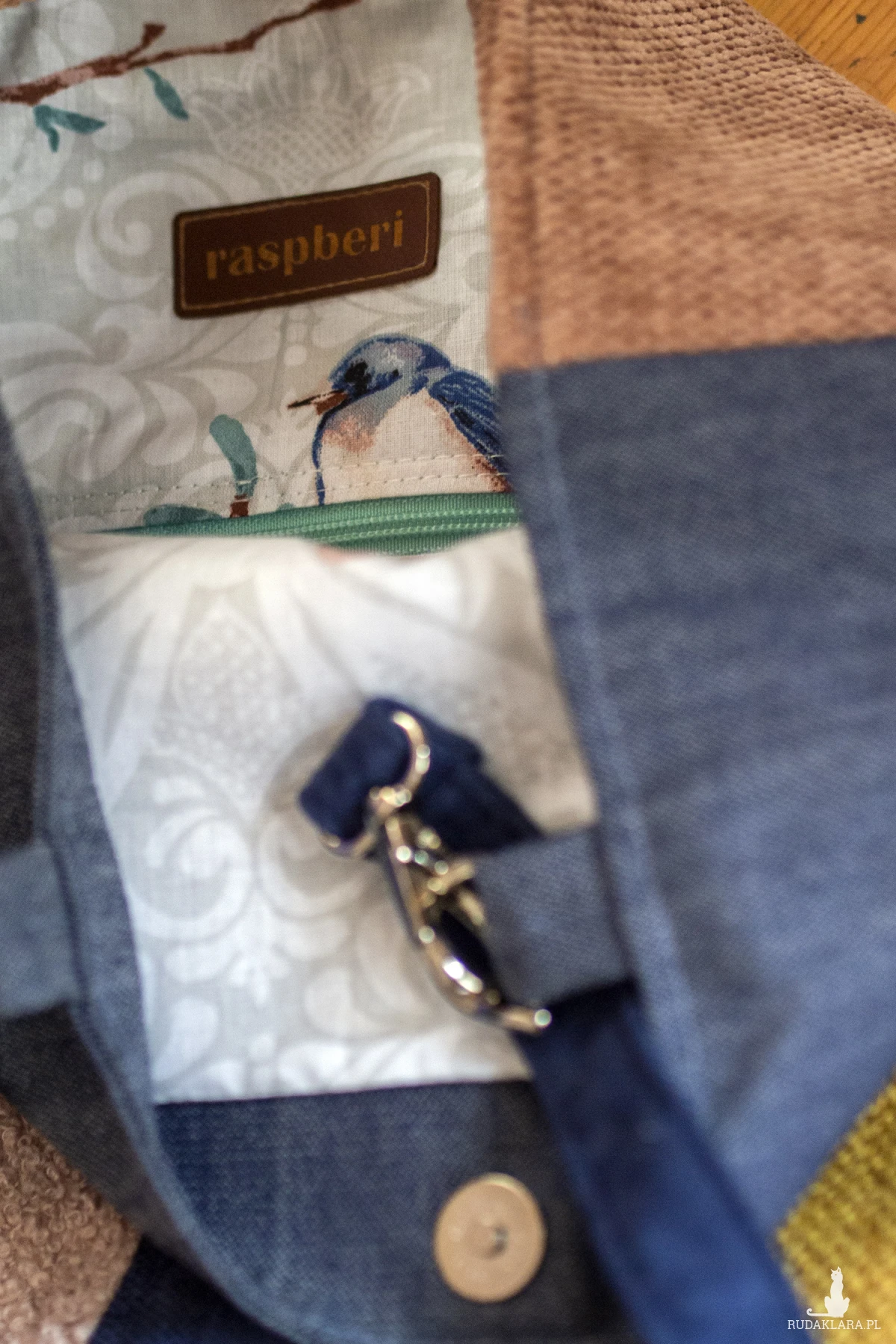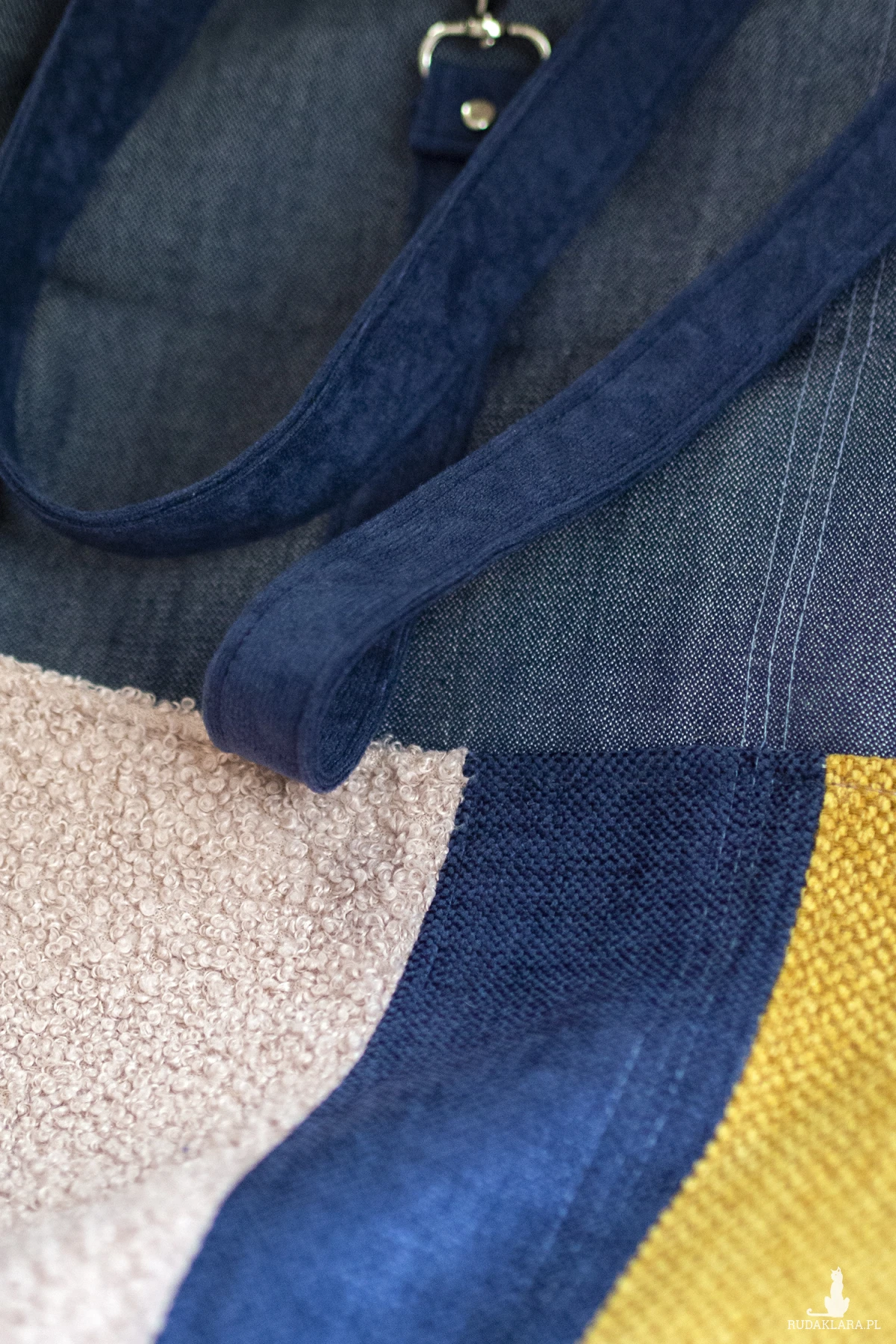 Z przodu dwie kieszenie w stylu patchwork. Całość zapinana na zapięcie magnetyczne.