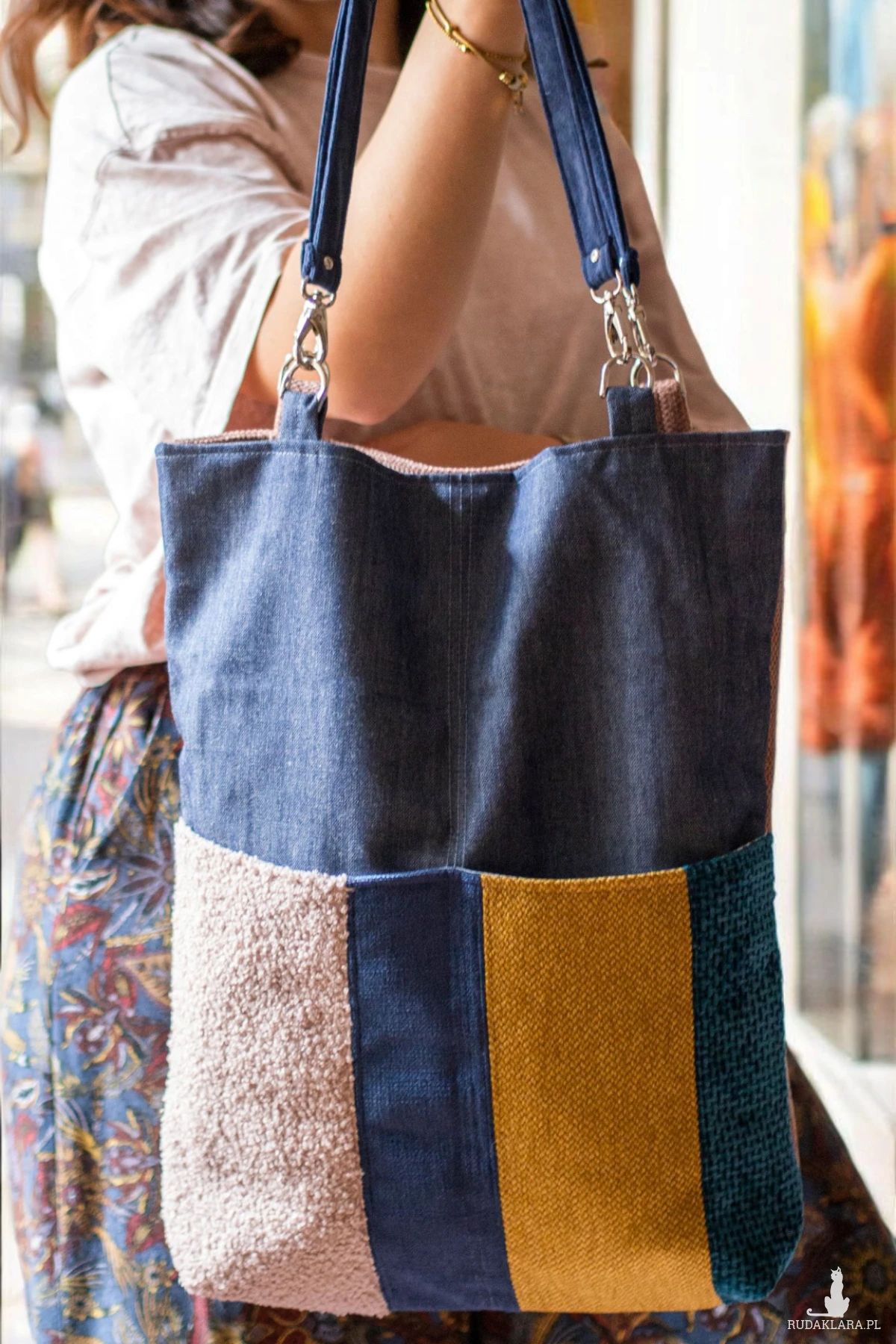 Duża torba na ramię wykonana z niebieskiego jeansu oraz pudroworóżowej plecionki.