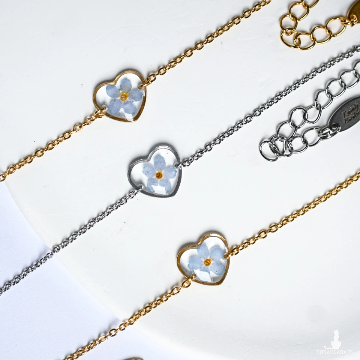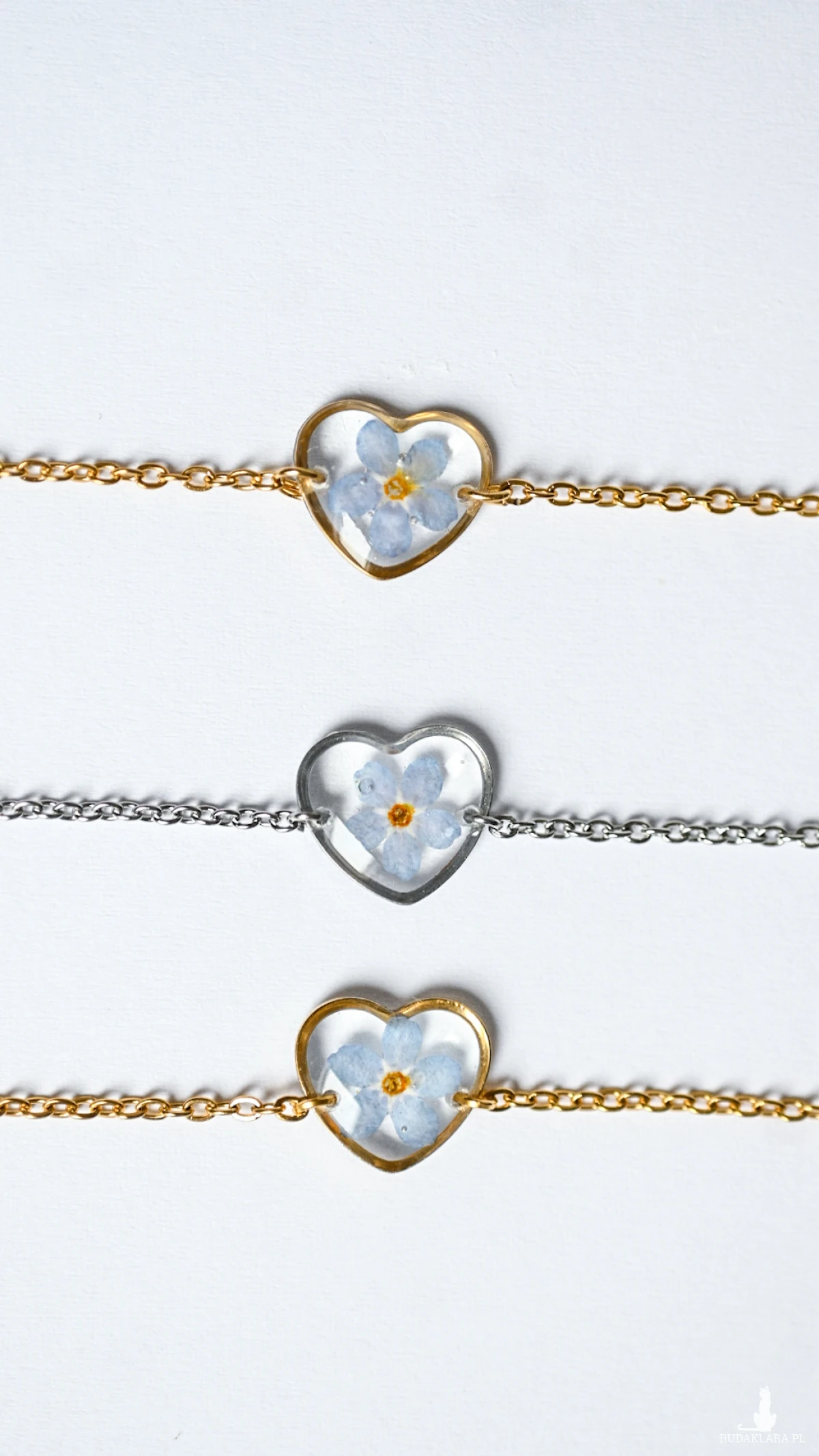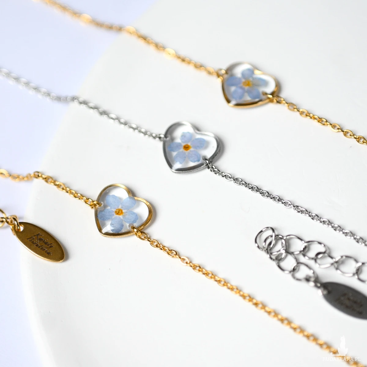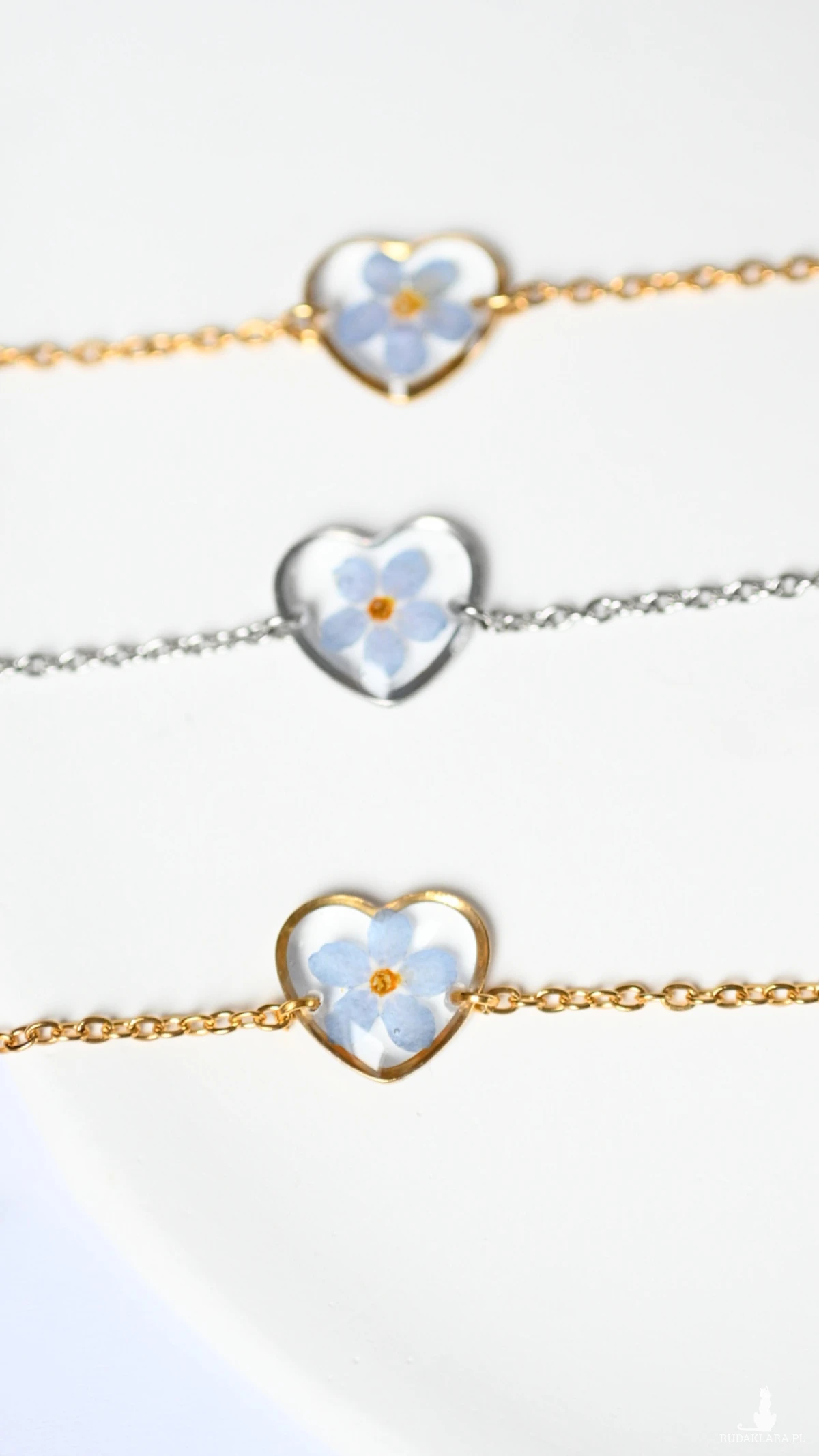 Delikatna, ręcznie robiona bransoletka z zatopioną w żywicy prawdziwą niezapominajką. Dostępna w wersji pozłacanej lub srebrnej.