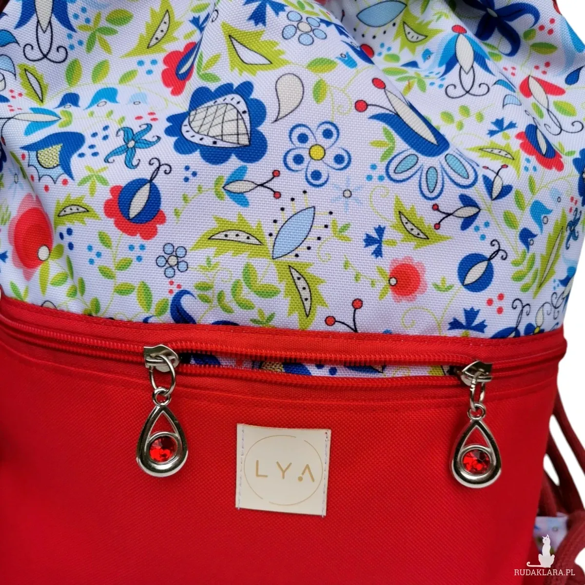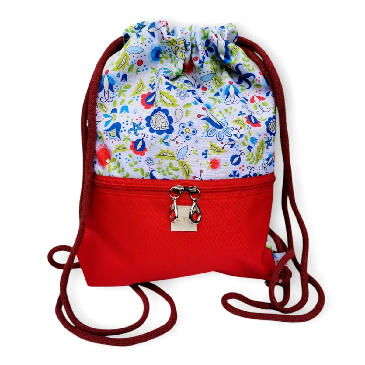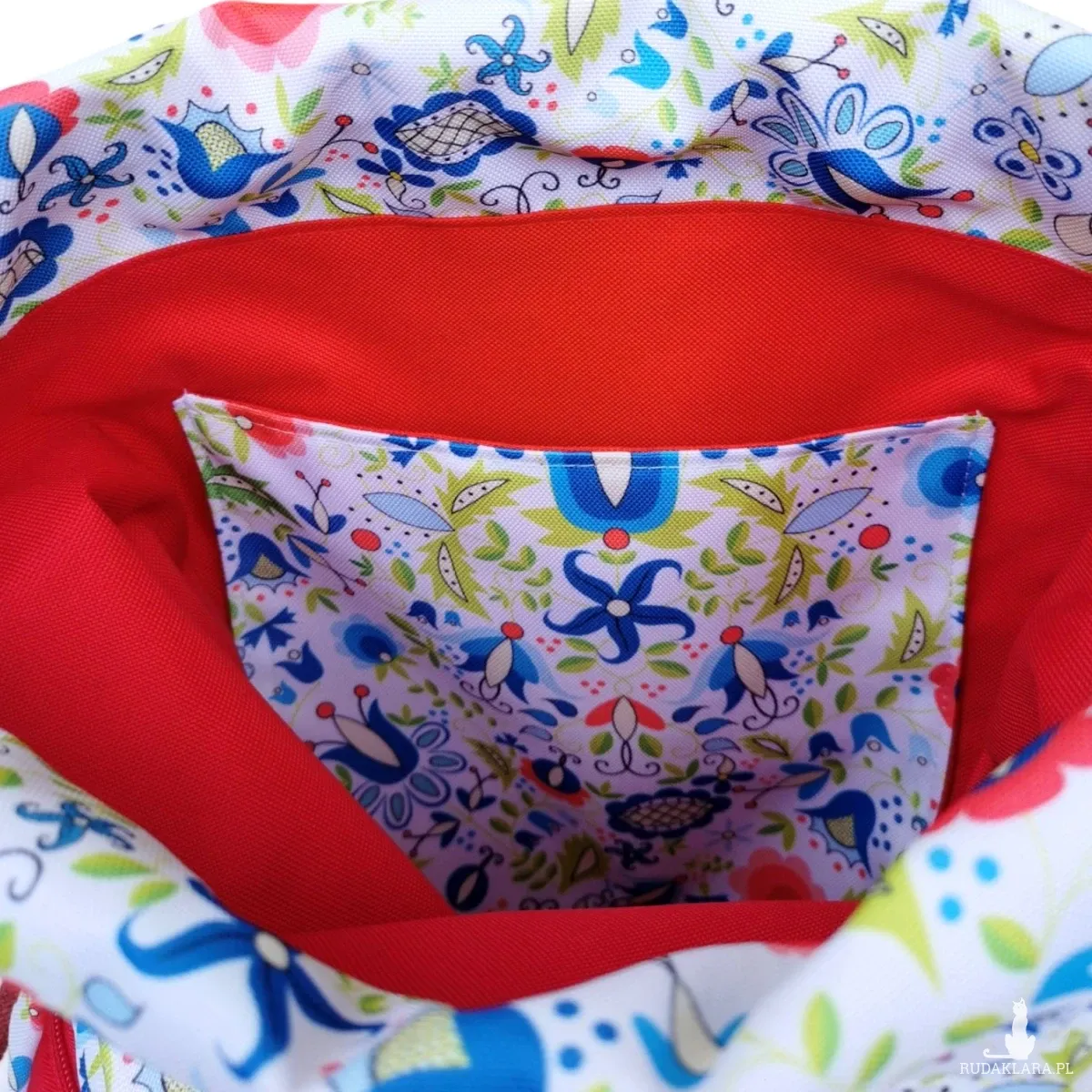 W środku worka jest także wodoodporna podszewka w kolorze czerwonym oraz kieszonka która pomieści drobiazgi takie jak klucze, telefon itp. Worko plecak ma zewnętrzną kieszonkę zapinaną na zamek.