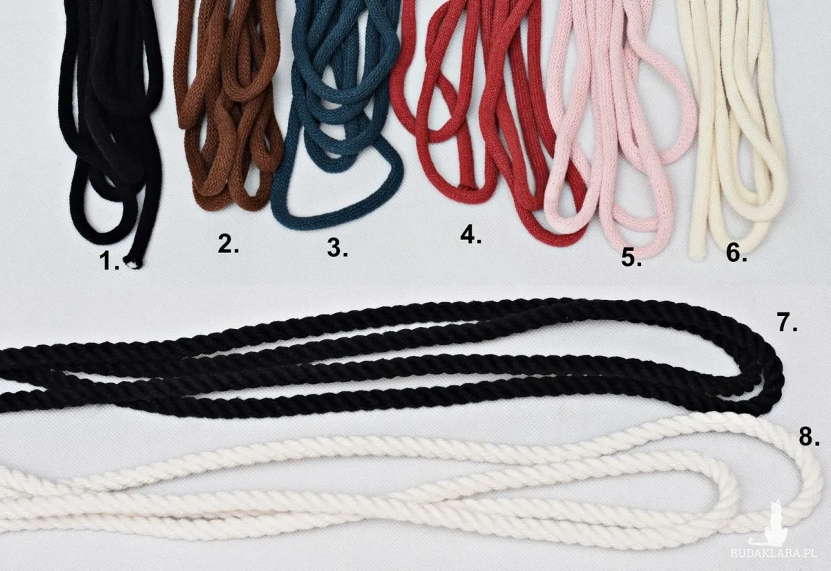 Możesz wybrać rodzaj i kolor sznura. Cieńszy bardziej miękki - kolory do wyboru lub grubszy skręcany bawełniany biały lub czarny. W przypadku braku wyboru uszyję ze sznurem jak na zdjęciu..