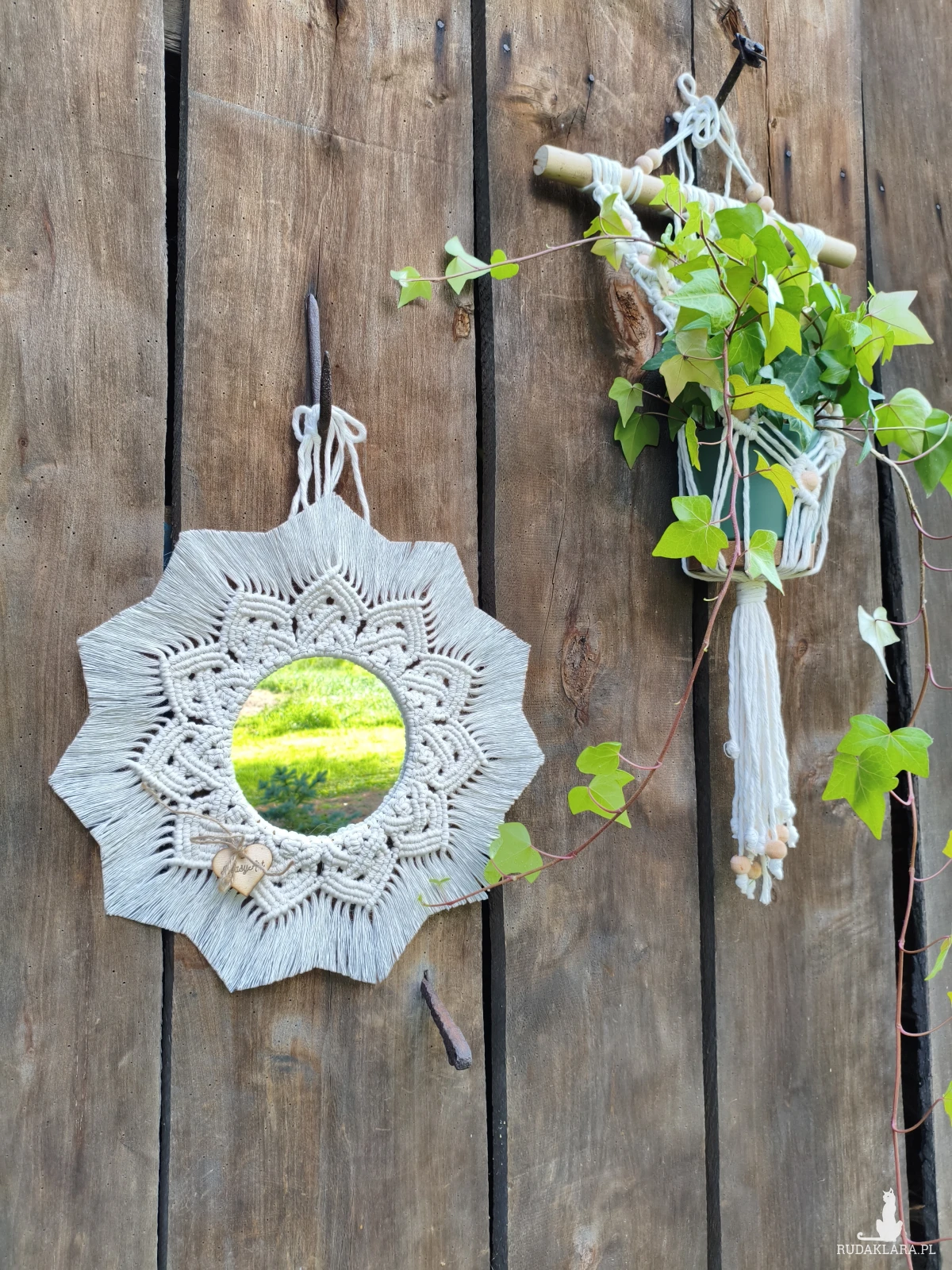 Mandale z lusterkiem, całkowita średnica wynosi ok 40 cm, średnica samego lustra wynosi 15 cm. Wykonana z sznurka skręcanego 3 mm w kolorze naturalnym z dodatkiem drewnianych koralików, brzegi mandali zostały usztywnione.