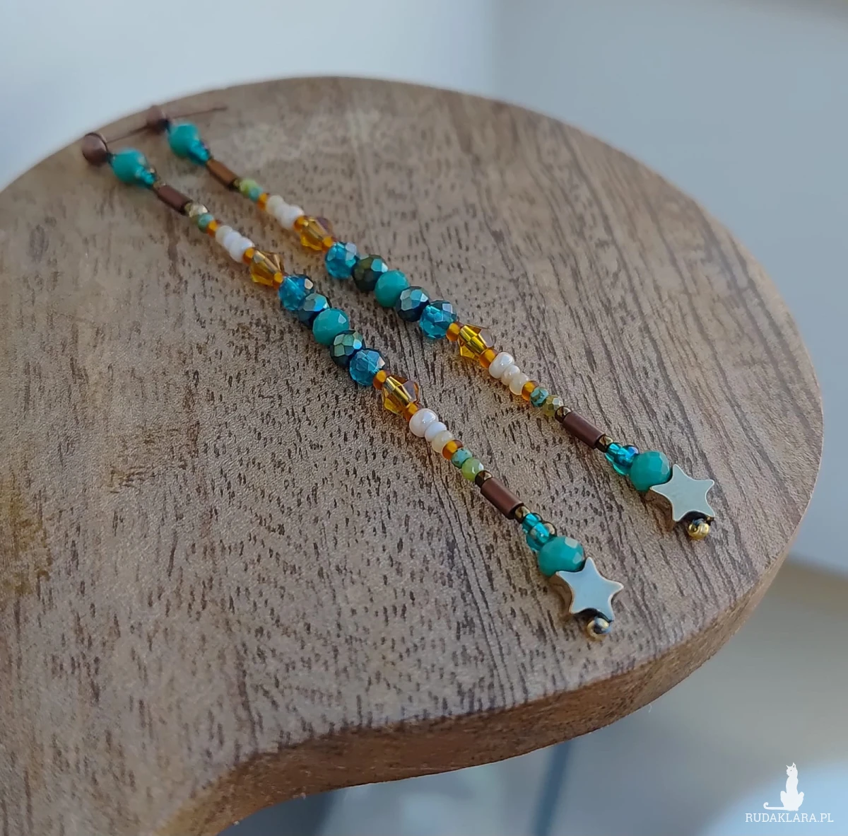 Kolczyki minimalistyczne cienkie nitki z koralikami. Koraliki szklane kolorowe. Długość 88 mm, metalowe sztyfty, silikonowy baranek.