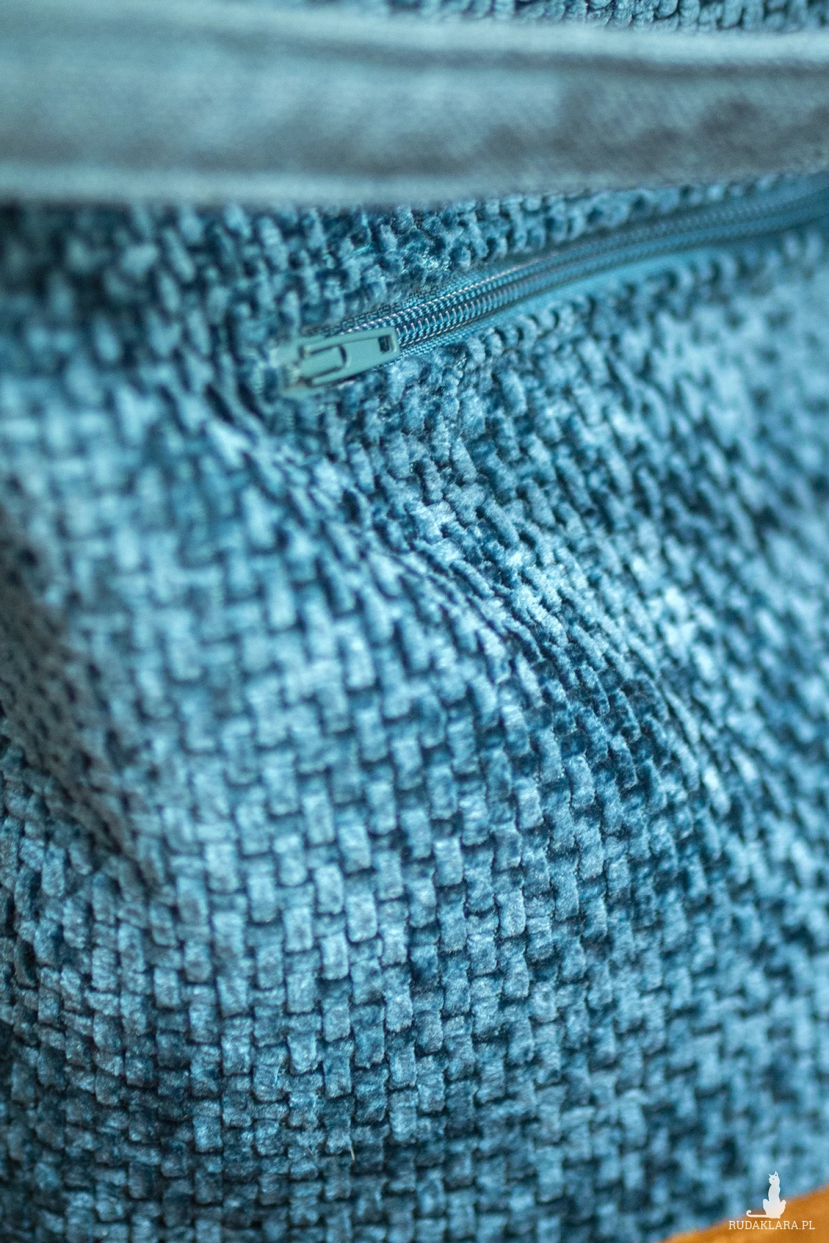 Średniej wielkości torebka w stylu boho. Worek zapinany na suwak z okrągłym, usztywnianym dnem wykonany z turkusowej tkaniny typu welur oraz miodowego weluru. Turkusowe paski.