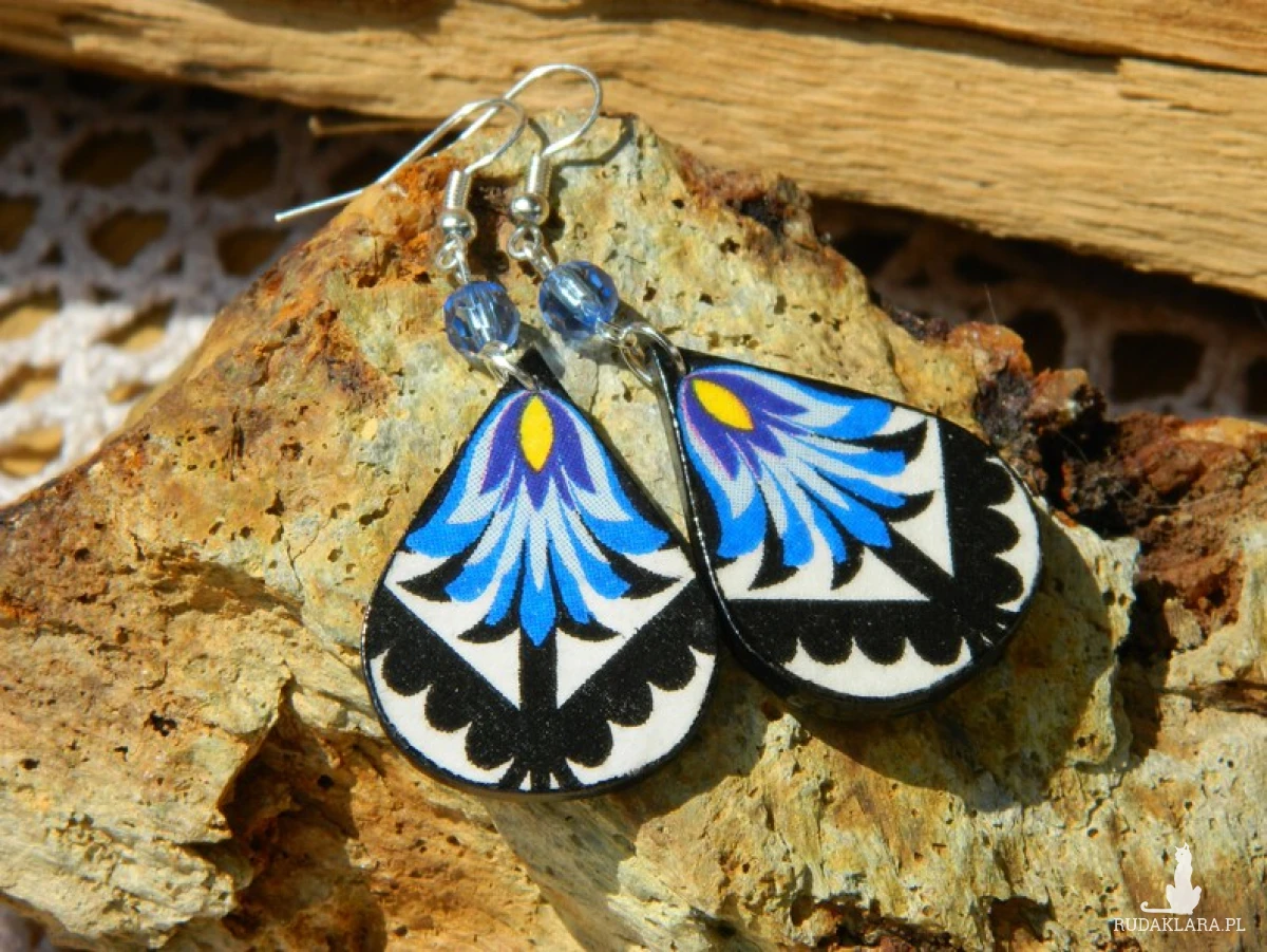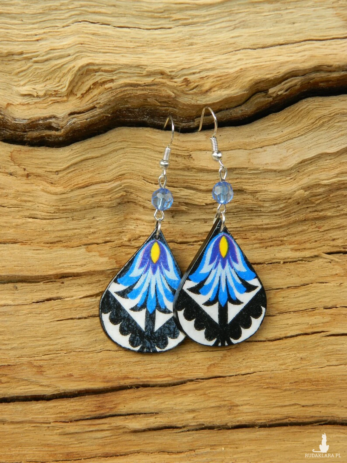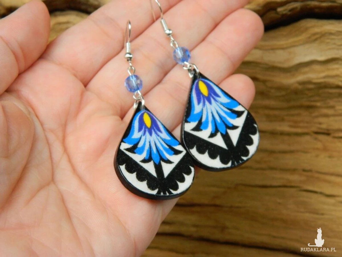 Kolczyki są wykonane ze sklejki drewnianej o grubości 3 mm i są bardzo lekkie. Zostały ozdobione dwustronnie metodą decoupage’u, a następnie wielokrotnie pokryte lakierem akrylowym w celu zabezpieczenia i zapewnienia trwałości. Kilkakrotnie szlifowane, dzięki czemu mają jedwabistą, miłą w dotyku fakturę. Grafika nie ulega blaknięciu.