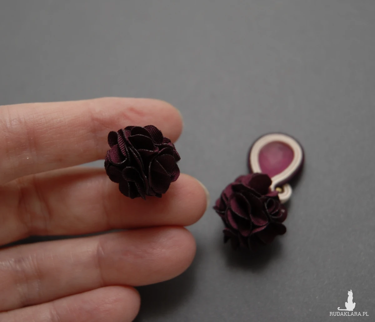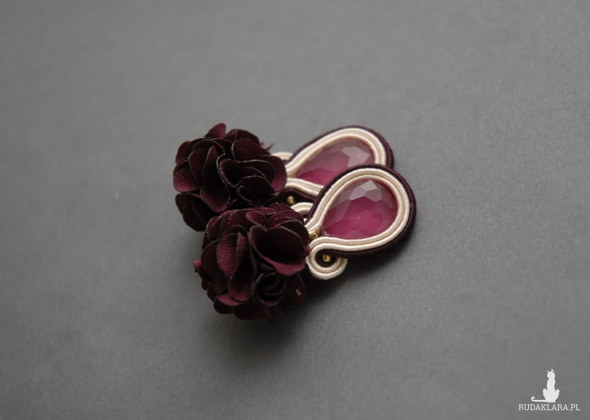 bordowo-kremowe kolczyki lub klipsy sutasz z kwiatkami