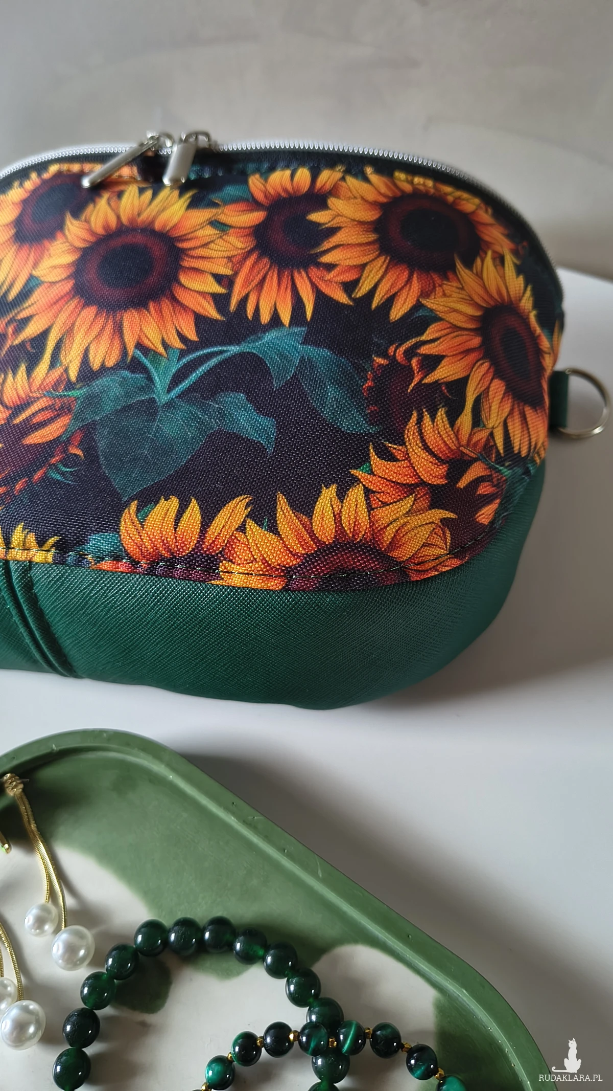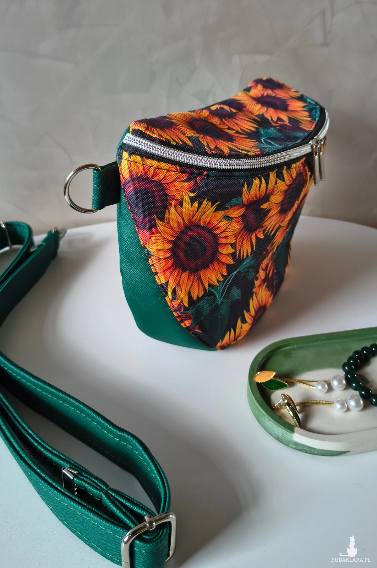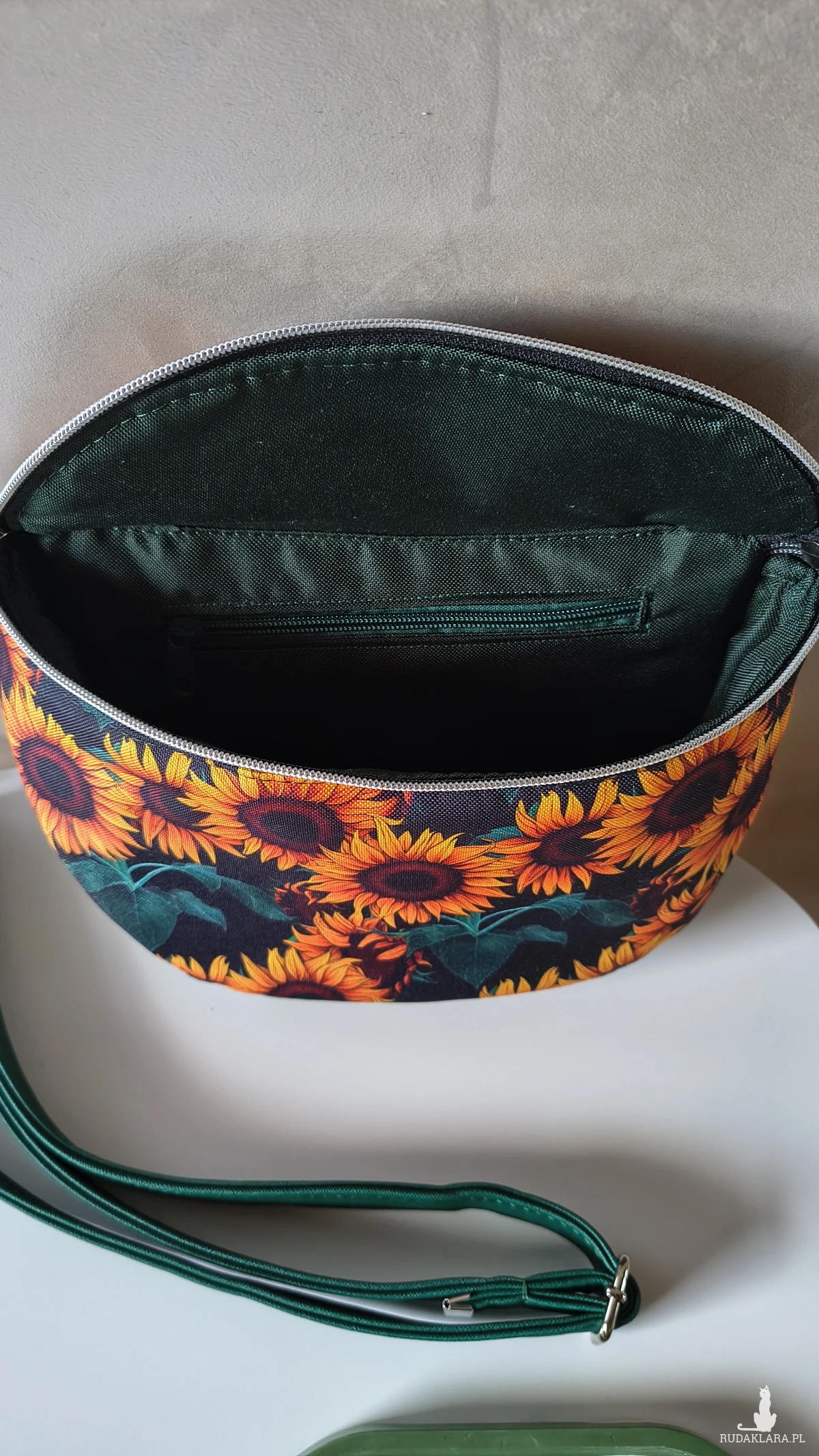 Torebka wykonana z ekoskóry w kolorze butelkowa zieleń oraz poliestru wodoodpornego w słoneczniki. Wewnątrz znajduje się wodoodporna podszewka z kieszonką na zamek. Pasek wykonany z ekoskóry, regulowany.