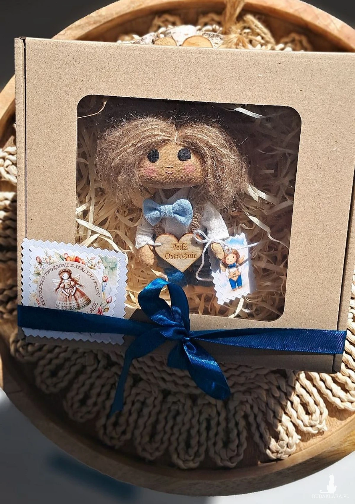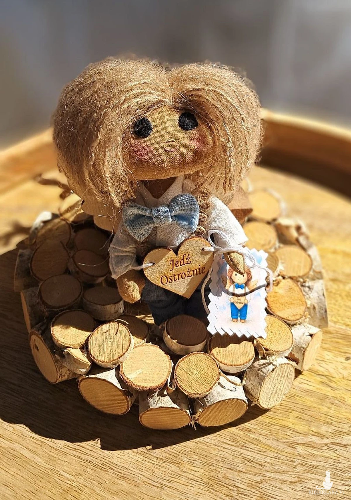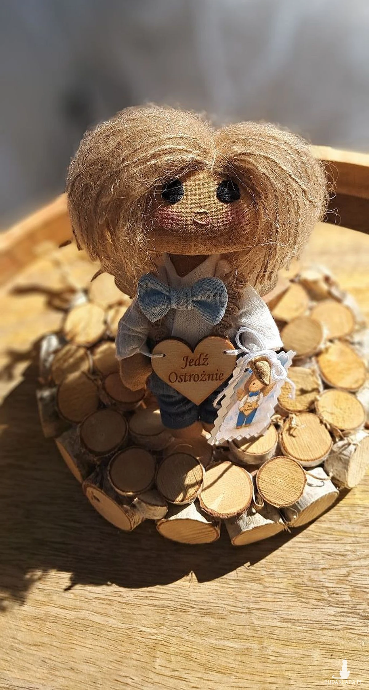 Mam do sprzedania aniołka widocznego na załączonych fotografiach. Ciałko uszyte z surówki bawełnianej, barwione kawą, wypełnione antyalergiczną kulką silikonową. Koszula koloru białego uszyta z lnu, spodenki koloru niebieskiego lniane, na szyi lniana mucha również koloru niebieskiego. Włosy wełniane kolor brązowego. Skrzydełka ze sklejki drewnianej. Buźka wyszyta nićmi. W rączkach posiada sklejkowe serce z napisem - Jedź ostrożnie. Wysokość aniołka 14 cm.
