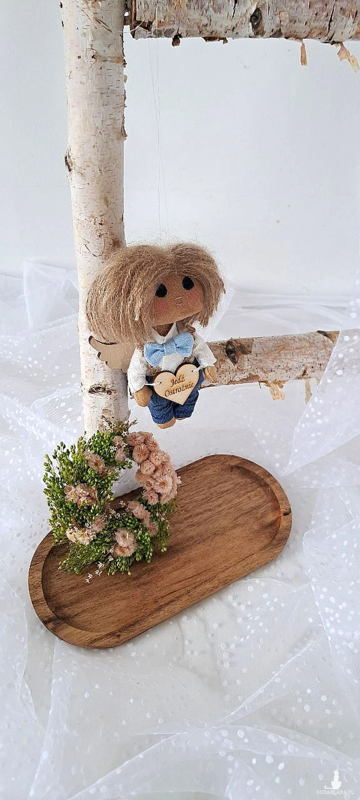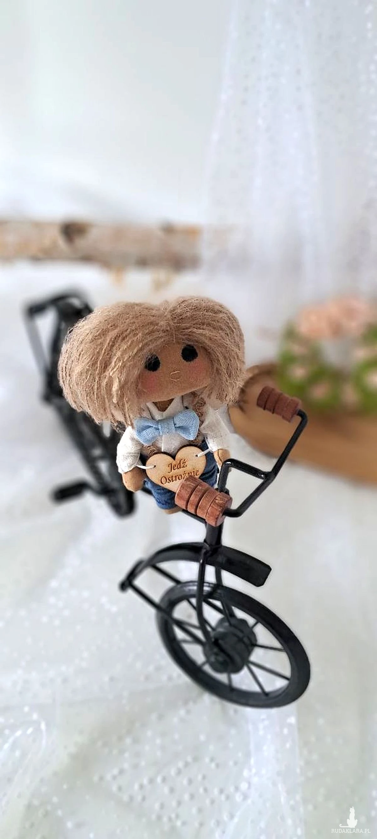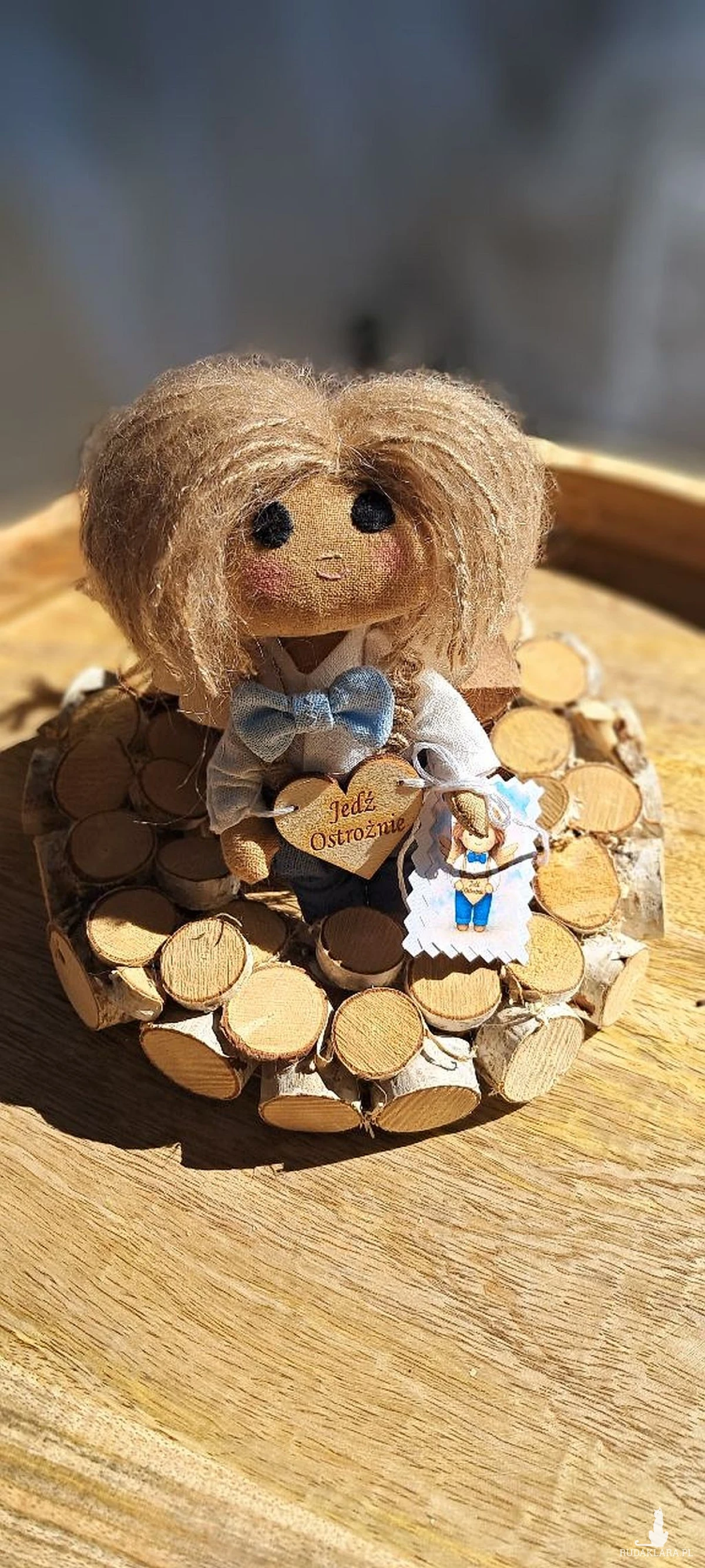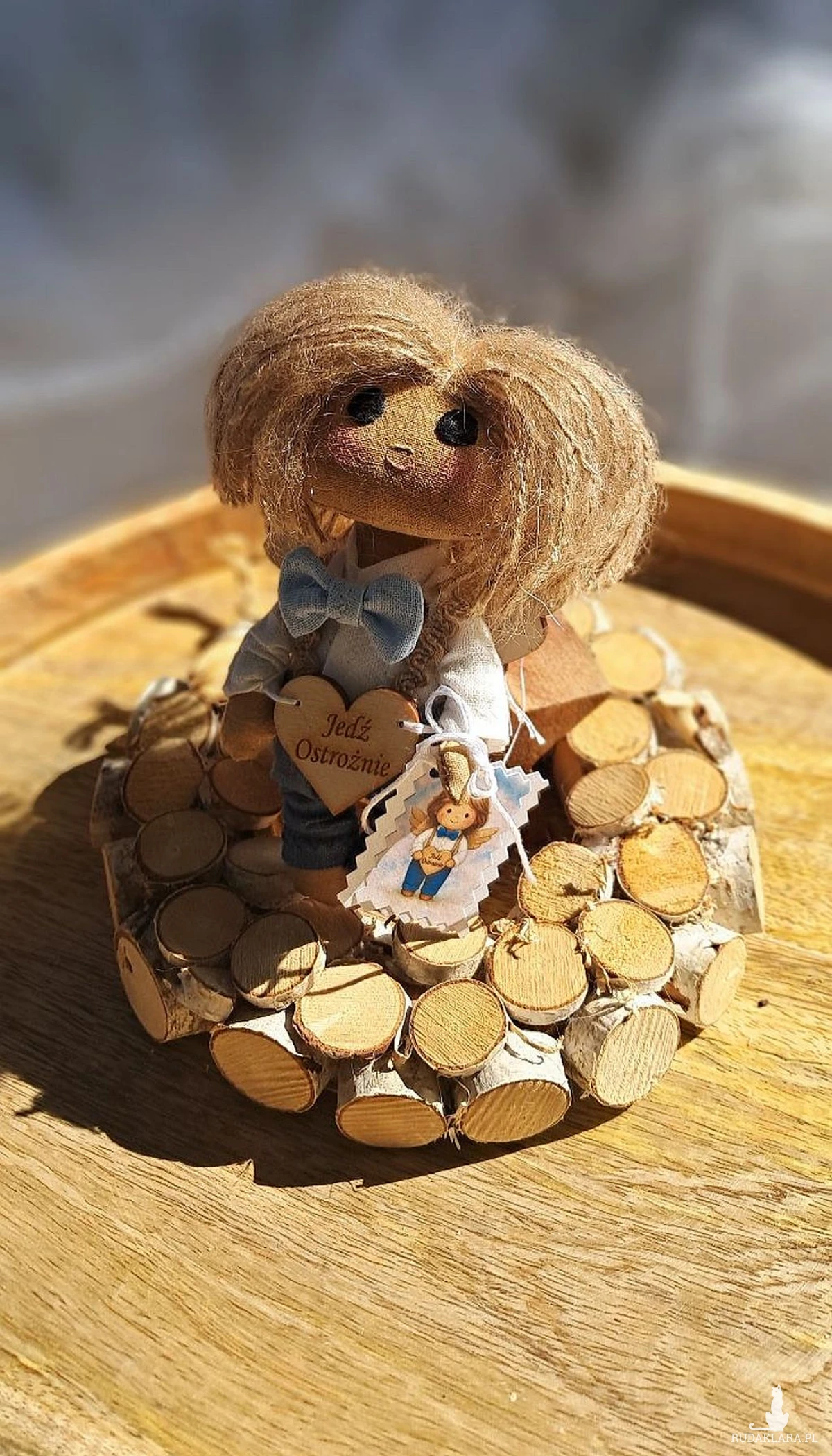 Mam do sprzedania aniołka widocznego na załączonych fotografiach. Ciałko uszyte z surówki bawełnianej, barwione kawą, wypełnione antyalergiczną kulką silikonową. Koszula koloru białego uszyta z lnu, spodenki koloru niebieskiego lniane, na szyi lniana mucha również koloru niebieskiego. Włosy wełniane kolor brązowego. Skrzydełka ze sklejki drewnianej. Buźka wyszyta nićmi. W rączkach posiada sklejkowe serce z napisem - Jedź ostrożnie. Wysokość aniołka 14 cm.