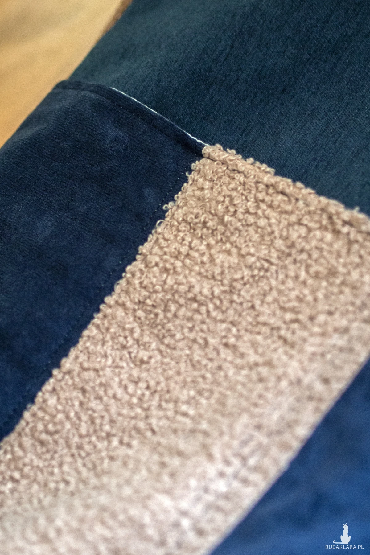 Z przodu dwie kieszenie w stylu patchwork. Całość zapinana na zapięcie magnetyczne.