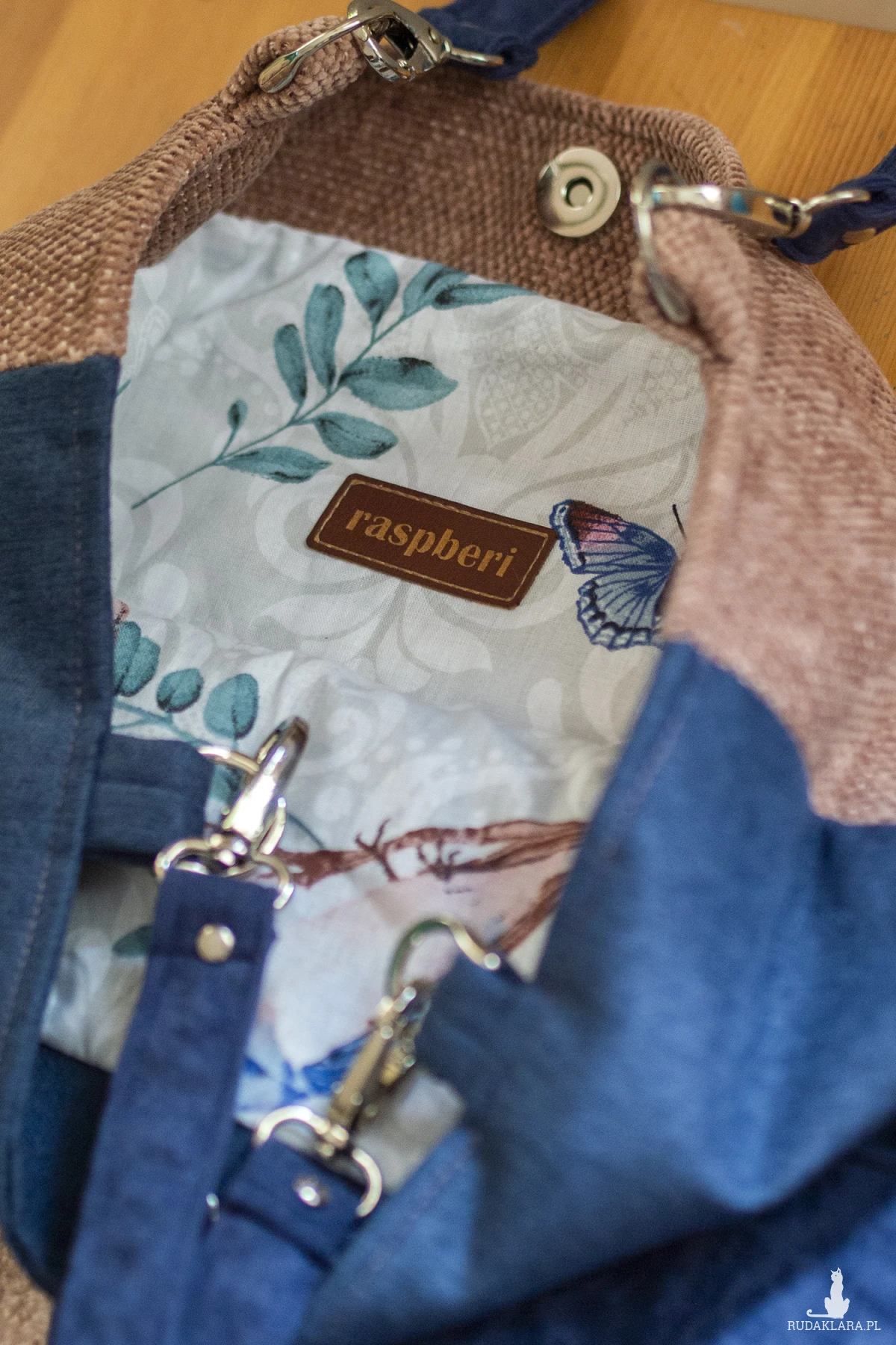 Bawełniana, biała podszewka we wzory, w środku i z tyłu torby kieszonki zapinane na suwak.