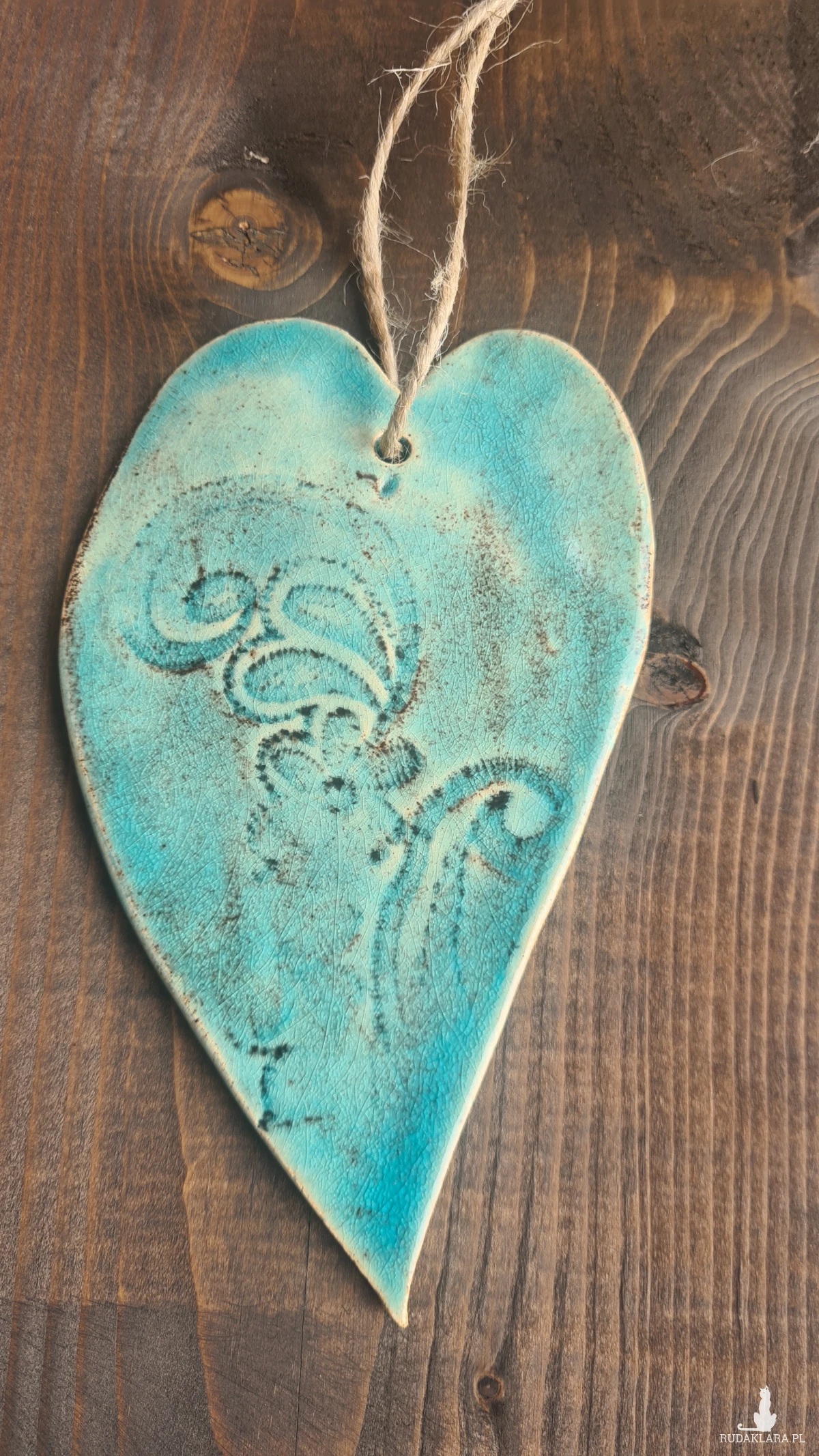 Serce ceramiczne - rękodzieło z motywem koronki będzie ozdobą Twojego domu. Wykonane z jasnej gliny, szkliwione pięknym turkusowym szkliwem. Wypalane dwukrotnie w wysokiej temperaturze w piecu ceramicznym. Wymiary 15 cm. Polecam :)