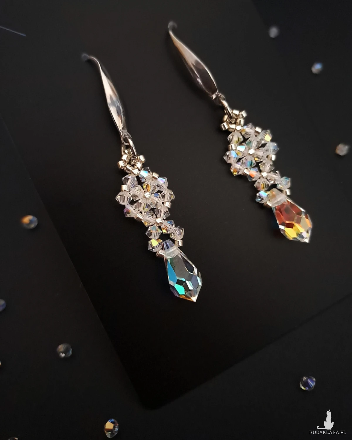 Każdy egzemplarz powstaje ręcznie – z precyzyjnie dobranych kryształków Preciosa Crystal AB i koralików Miyuki Delica w srebrnym odcieniu.