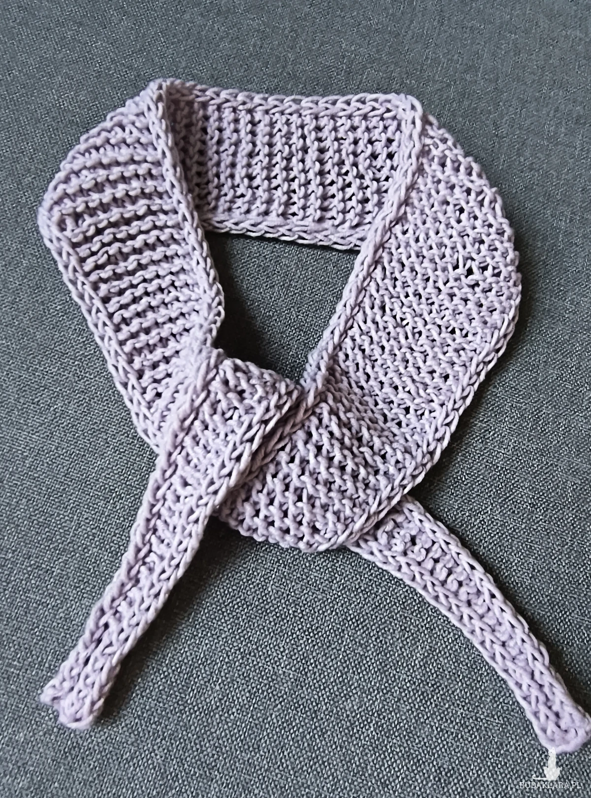 Apaszka robiona na szydełku. Miły akcent do każdej stylizacji. Można również wiązać jako przepaskę do włosów. Jasny wrzos.