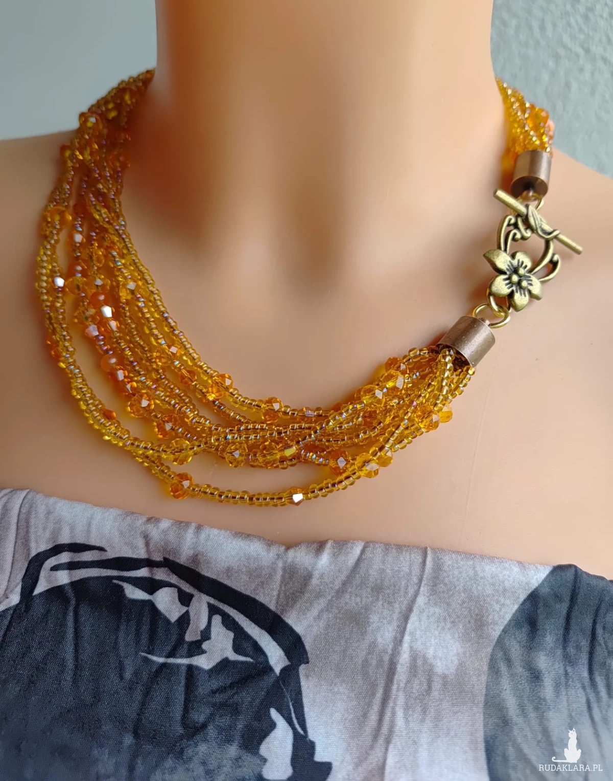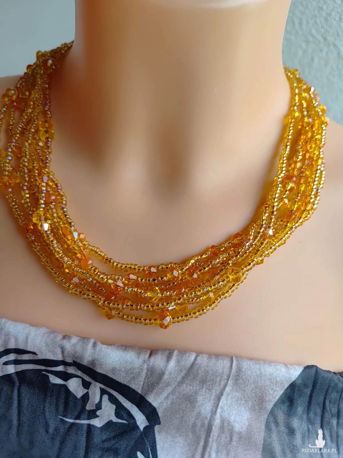 Naszyjnik z koralików szklanych w miodowym kolorze, koraliki szklane kryształki 5 mm, inne koraliki drobne 2 mm, bicone, oponki, rocaile. Zapięcie metalowe. Objętość bez regulacji 46 cm
