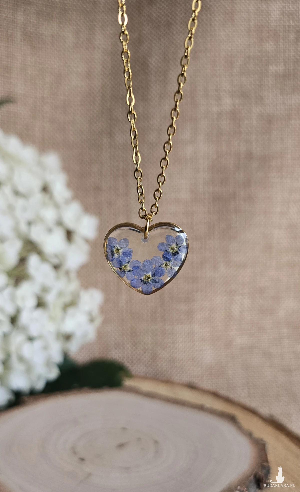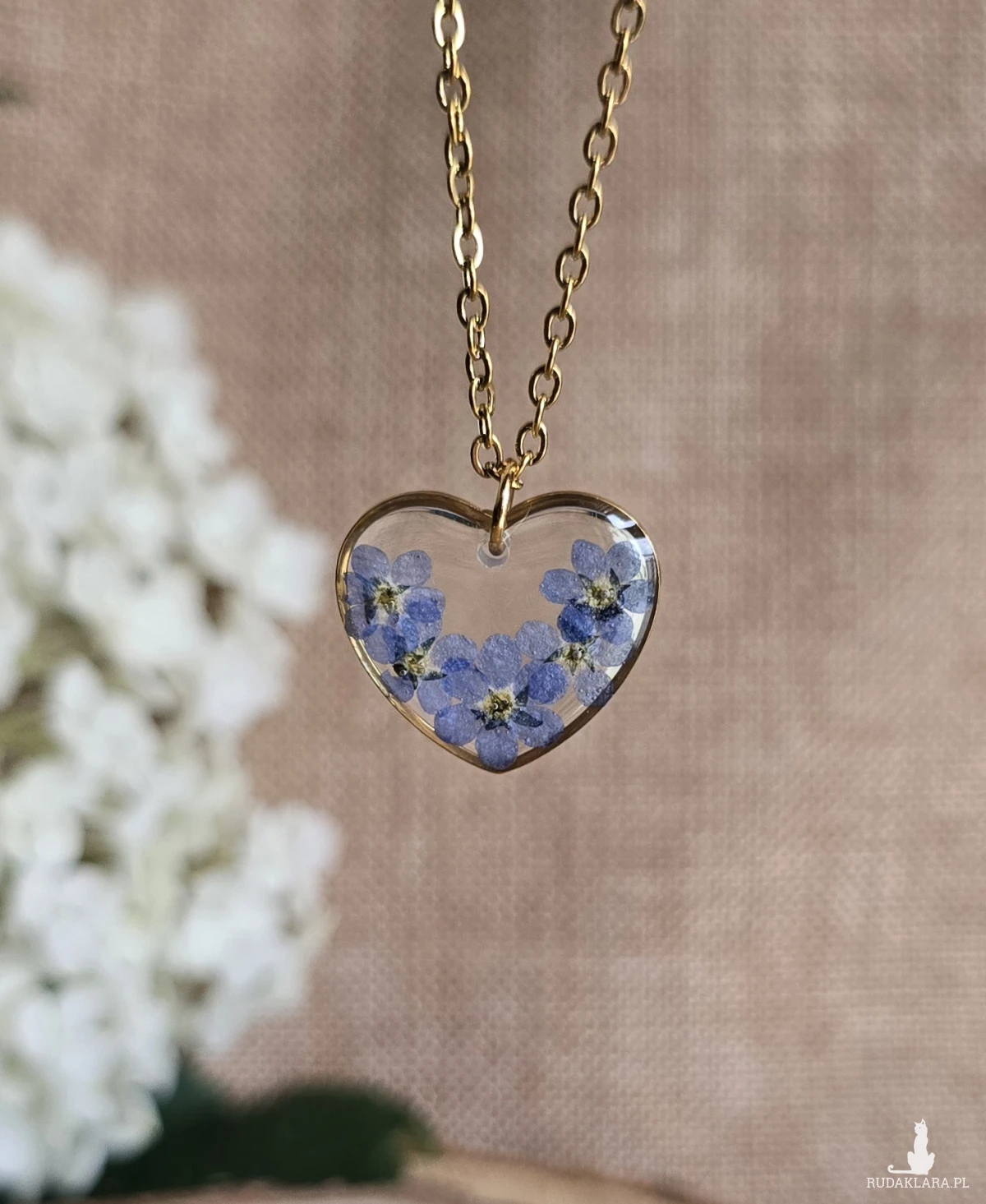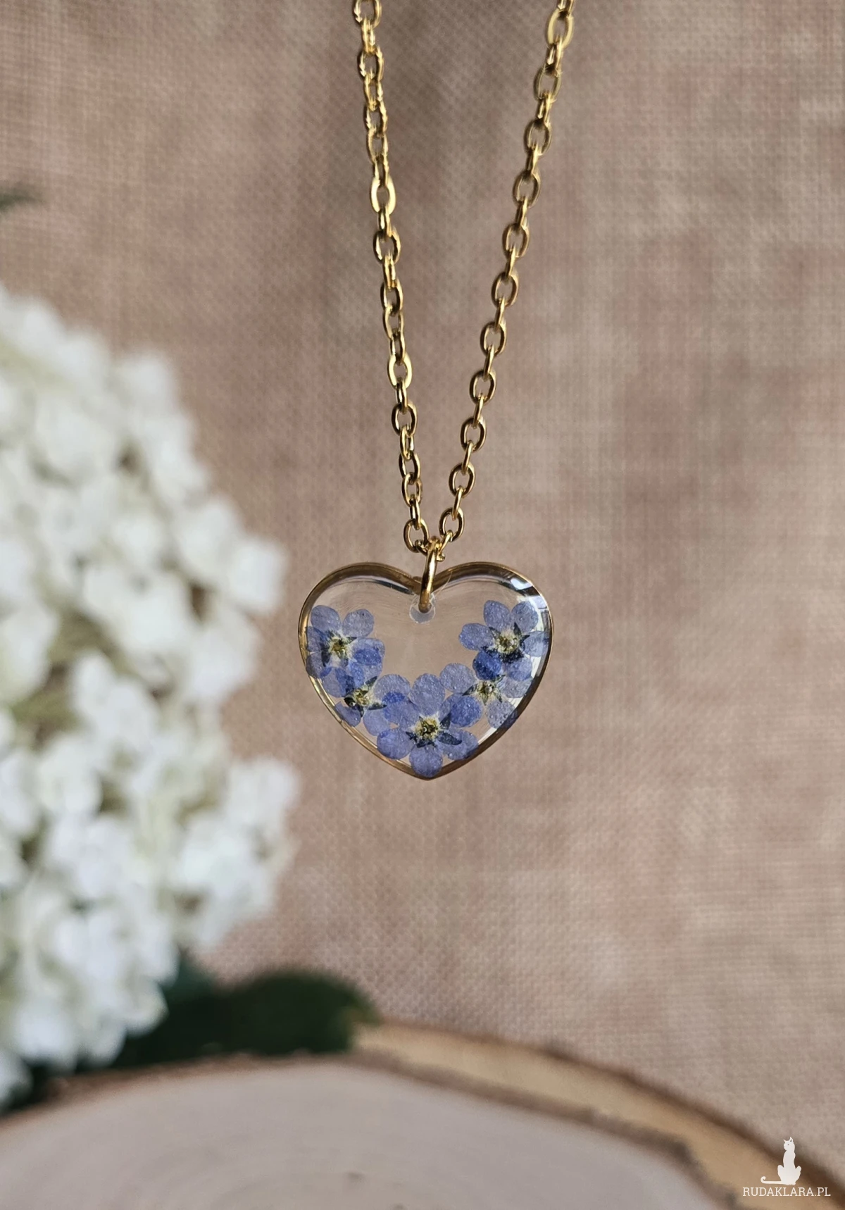 Złota zawieszka złoty wisiorek kwiat naszyjnik żywica z żywicy kwiaty serce serduszko niezapominajki niezapominajkami prawdziwe suszone kwiaty niezapominajka