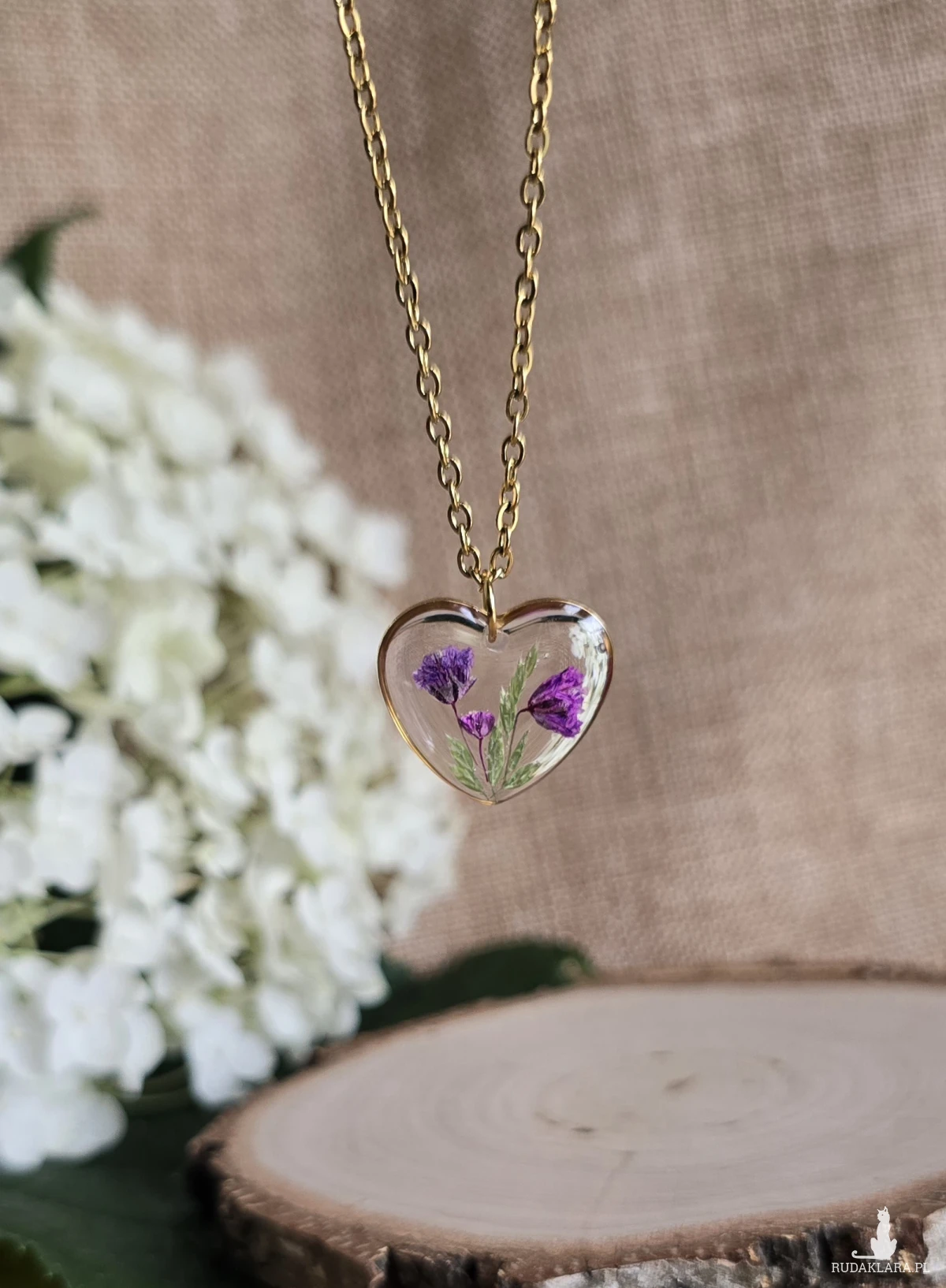 Złota zawieszka złoty wisiorek kwiat naszyjnik żywica z żywicy kwiaty serce serduszko prawdziwe suszone kwiaty fioletowe