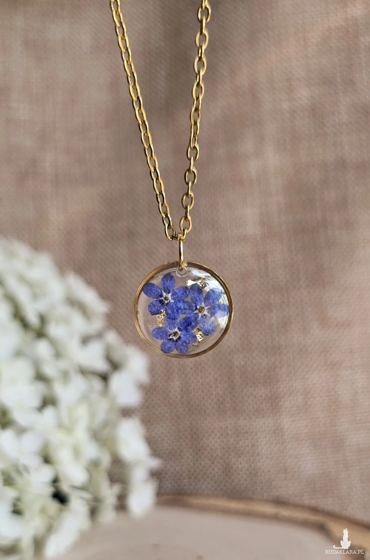 Niezapominajki złota zawieszka złoty wisiorek naszyjnik żywica z żywicy kwiaty z kwiatami retro naturalna dziewczęca kobieca niezapominajkami