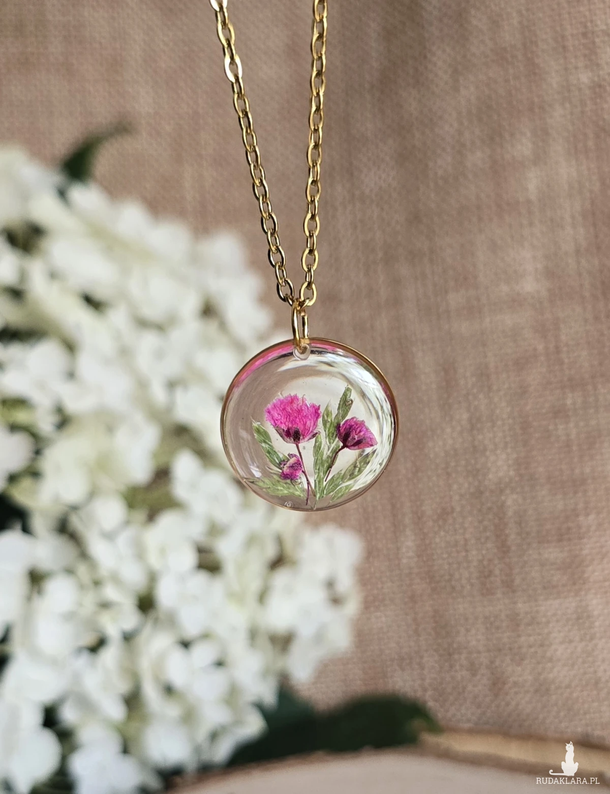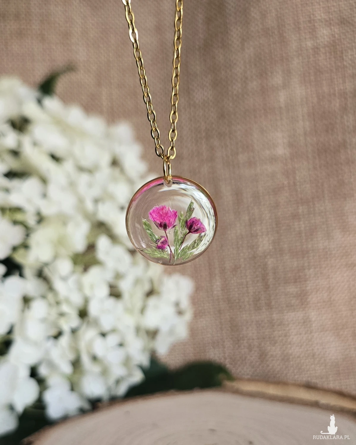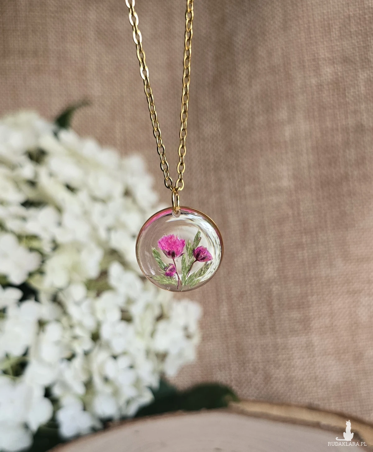 Oferuję Państwu unikalną biżuterię. Zawieszka jest wykonana z suszonych kwiatów i żywicy epoksydowej. Biżuteria jest wspaniałym i oryginalnym prezentem na lata.