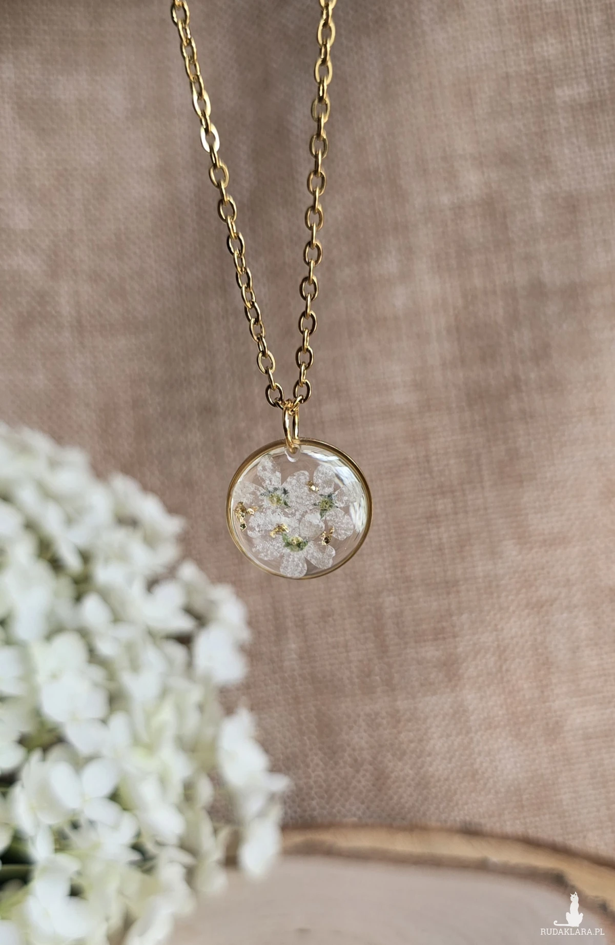 Oferuję Państwu unikalną biżuterię. Zawieszka jest wykonana z suszonych kwiatów i żywicy epoksydowej. Biżuteria jest wspaniałym i oryginalnym prezentem na lata.