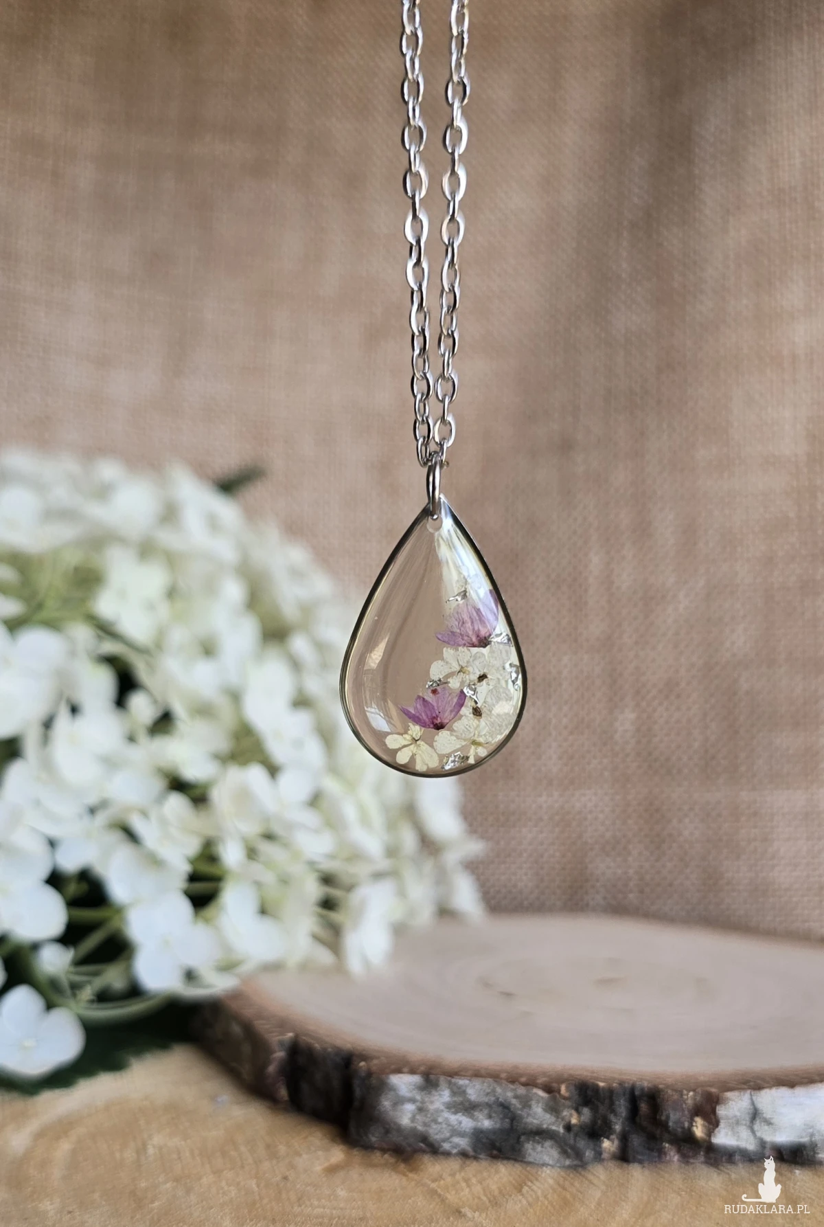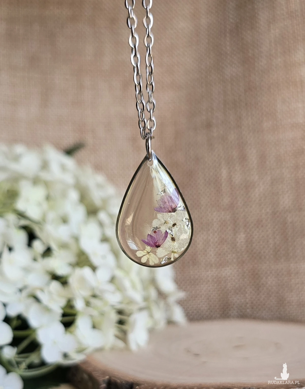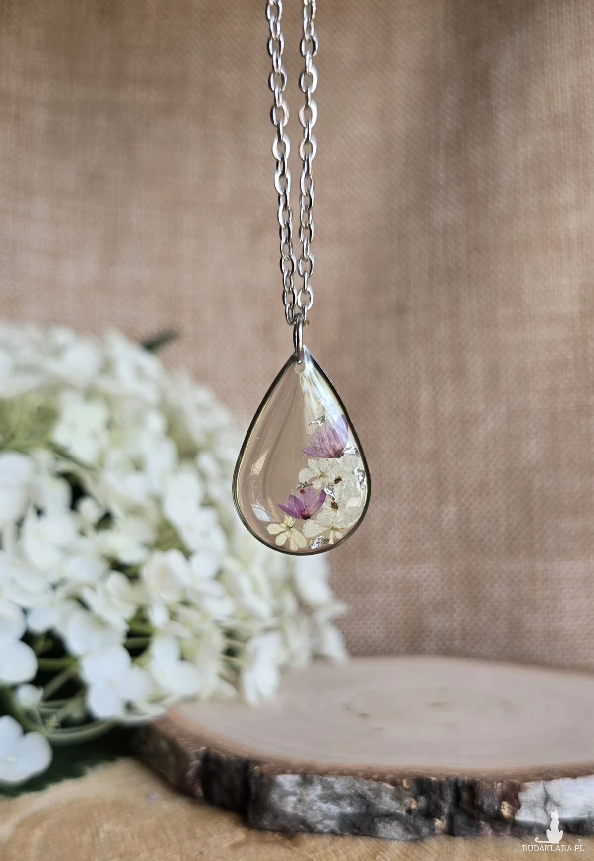 Oferuję Państwu unikalną biżuterię. Zawieszka jest wykonana z suszonych kwiatów i żywicy epoksydowej. Biżuteria jest wspaniałym i oryginalnym prezentem na lata.